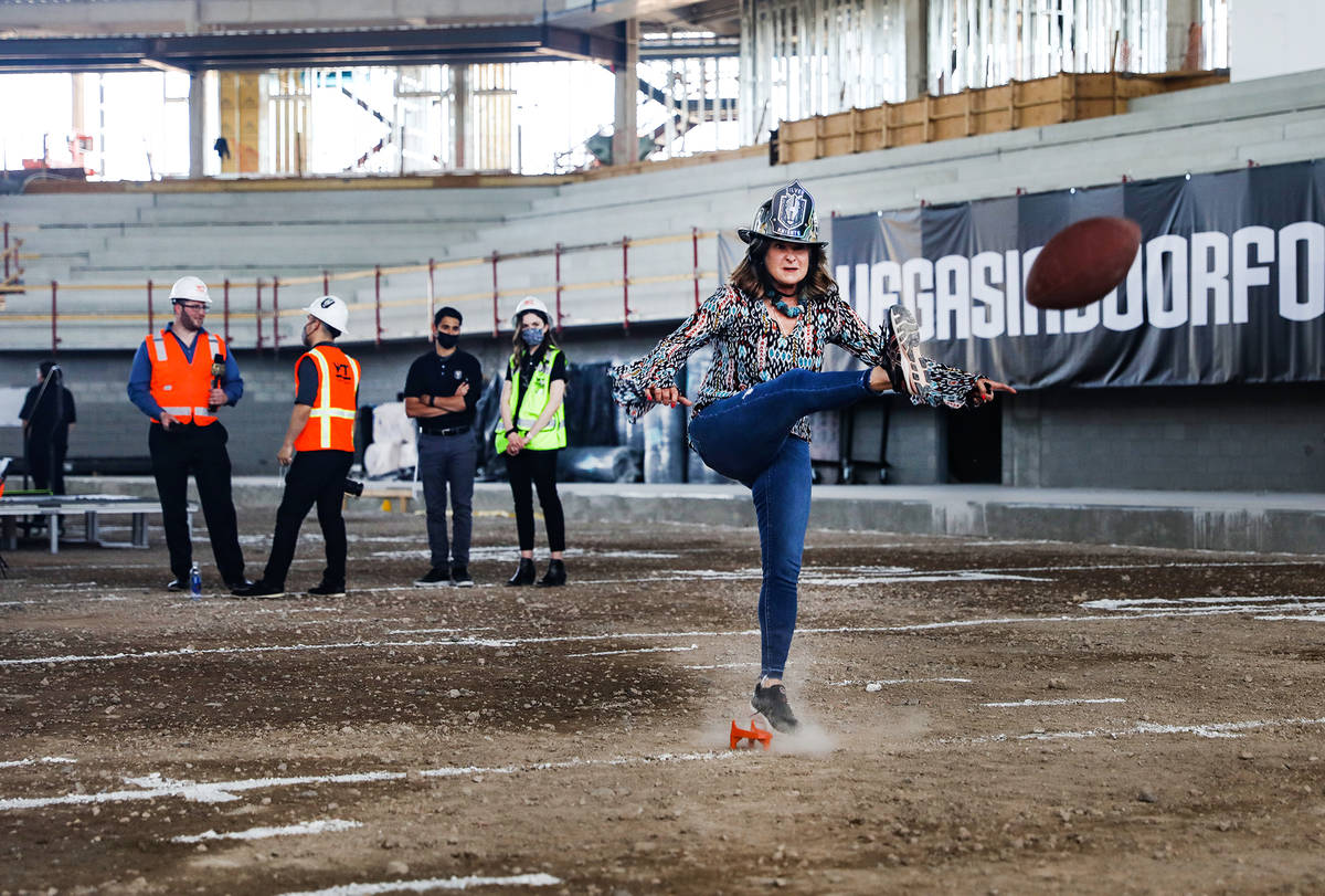 Henderson Mayor Debra March attempts a field goal at an event to announce that the Golden Knights have purchased an expansion franchise from the Indoor Football League at the Dollar Loan Center in Henderson, Tuesday, May 11, 2021. The Dollar Loan Center, still under construction and expected completion in 2022, will house both the IFL team and the American Hockey League’s Henderson Silver Knights. (Rachel Aston/Las Vegas Review-Journal) @rookie__rae