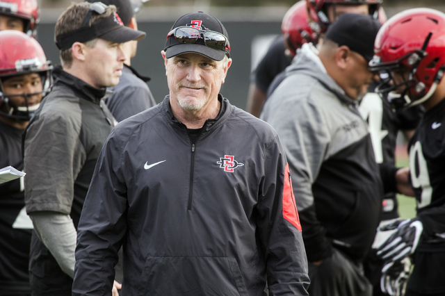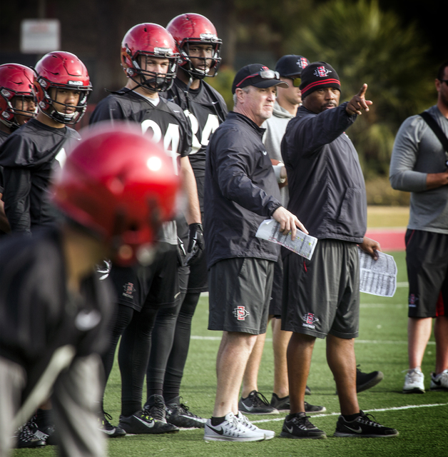 Aztecs special teams coordinator Bobby Hauck stepped foot on the field at Rebel Park for practice Wednesday morning for the first time since he left UNLV in 2014 after five seasons as head coach.