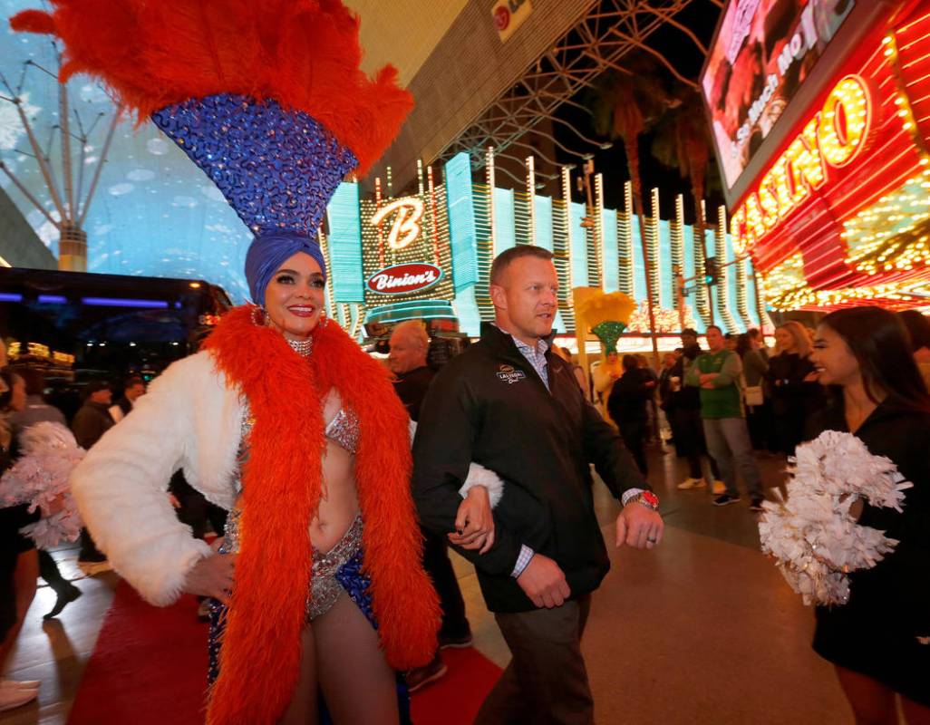 A showgirl escorts Boise State Broncos head coach Bryan Harsin to the Las Vegas Bowl welcome reception at Fremont Street Experience in Las Vegas, Wednesday, Dec. 13, 2017, as Harsin and his team arrive. Boise State Broncos and Oregon Ducks meet on Saturday, Dec. 16, in the Las Vegas Bowl. Chitose Suzuki Las Vegas Review-Journal