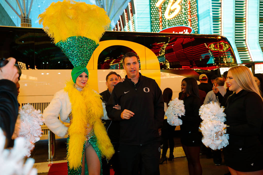 A showgirl escorts Oregon Ducks head coach Mario Cristobal to the Las Vegas Bowl welcome reception at Fremont Street Experience in Las Vegas, Wednesday, Dec. 13, 2017, as Cristobal and his team arrive. Oregon Ducks and Boise State Broncos meet on Saturday, Dec. 16, in the Las Vegas Bowl. Chitose Suzuki Las Vegas Review-Journal