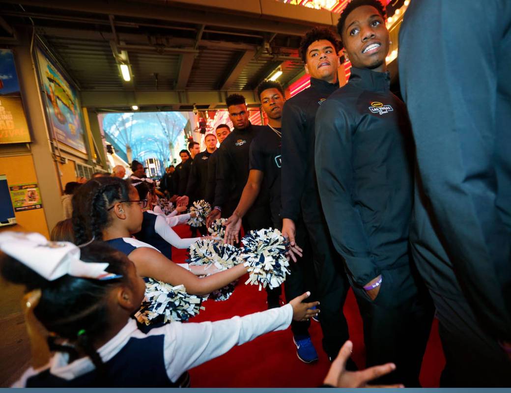 Boise State Broncos players and staff members arrive at the Las Vegas Bowl welcome reception at Fremont Street Experience in Las Vegas, Wednesday, Dec. 13, 2017. Boise State Broncos and Oregon Ducks meet on Saturday, Dec. 16, in the Las Vegas Bowl. Chitose Suzuki Las Vegas Review-Journal