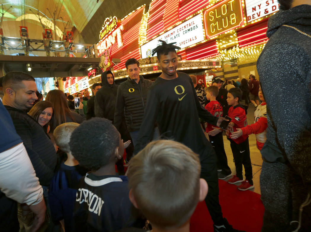 Oregon Ducks players and staff members arrive at the Las Vegas Bowl welcome reception at Fremont Street Experience in Las Vegas, Wednesday, Dec. 13, 2017. Oregon Ducks and Boise State Broncos meet on Saturday, Dec. 16, in the Las Vegas Bowl. Chitose Suzuki Las Vegas Review-Journal