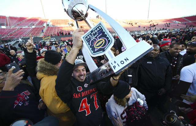 The big gain got the ball rolling for Pumphrey’s record-breaking performance as the Aztecs cruised to a 34-10 victory after trailing by 10 in the second quarter. Pumphrey ended his homecoming with 115 yards on the ground, a new record and the MVP trophy of the 25th Las Vegas Bowl.