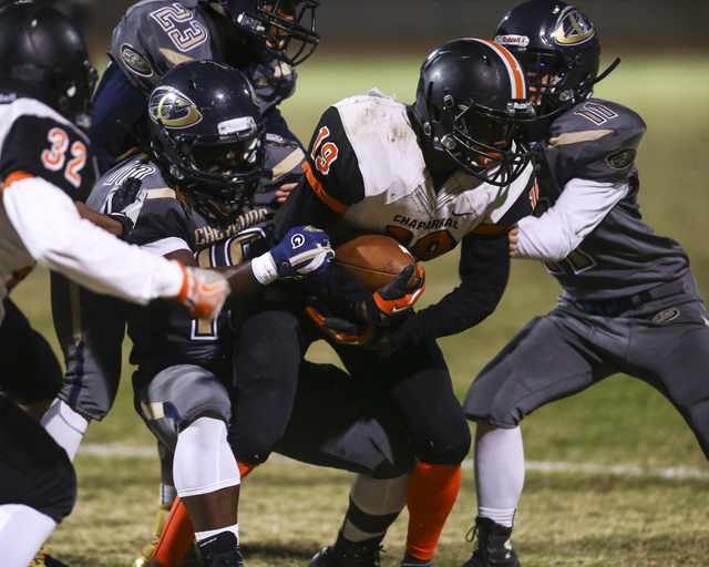 Chaparral (6-5) at Spring Creek (10-0) — The Cowboys came into the playoffs with a losing record and find themselves two wins away from a state title. Quarterback Santiago Vialpando continues to find receivers Devin Gaddy and Kentrell Petite, a pair that has combined for 2,077 receiving yards and 29 touchdowns. Chaparral will face its biggest test of the year in a Spring Creek team that has yet to lose, and much like the Cowboys, rely on strong quarterback play: Jon Jund has 2,984 yards passing and 34 touchdowns for the Spartans. Saturday’s winner will play for the state title against either South Tahoe or Desert Pines.