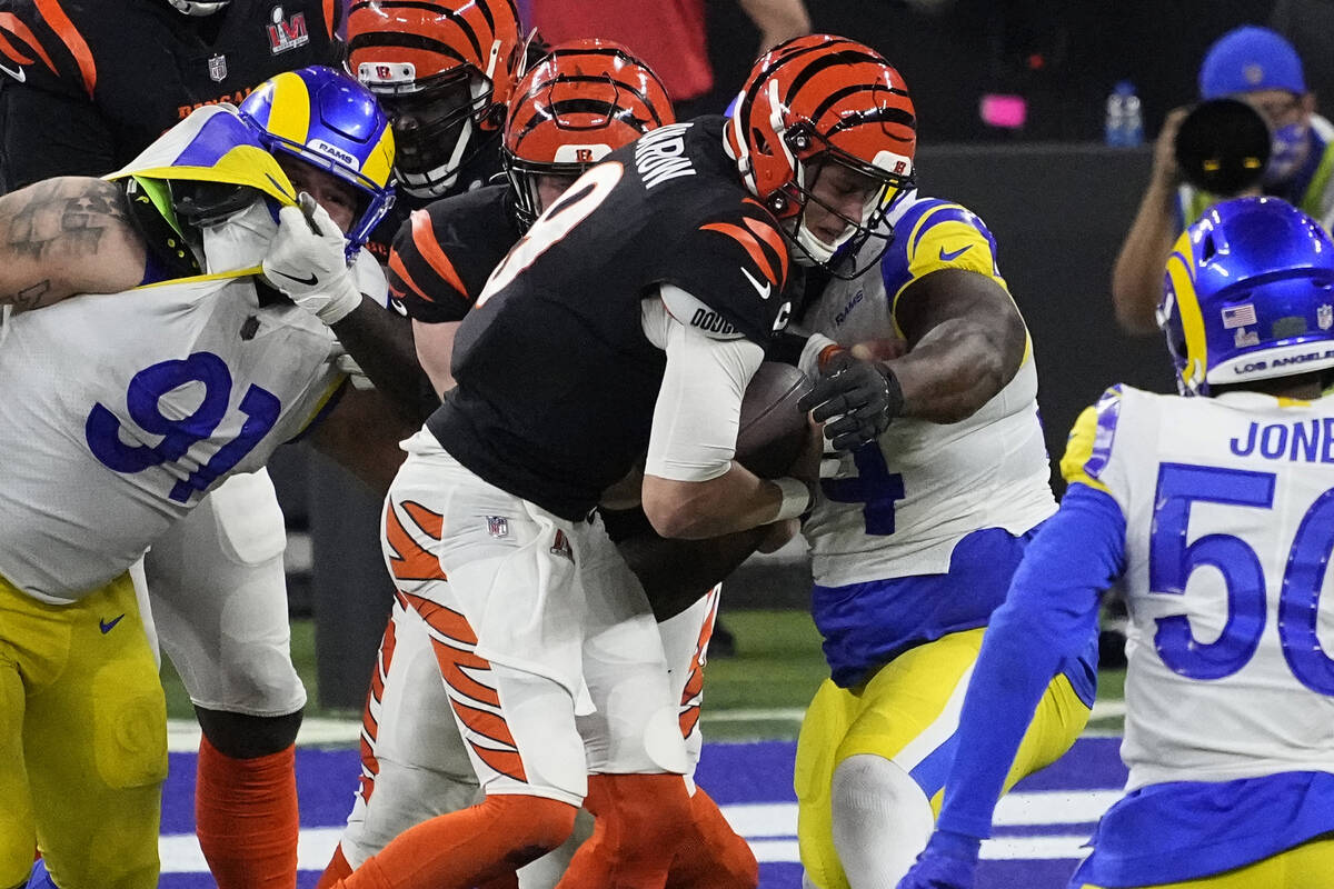 V: Best graphic illustrating that statistics sometimes are overrated: Rams quarterback Matthew Stafford tied for the NFL lead with 17 interceptions (he had two more Sunday) while Bengals counterpart Joe Burrow led the league by being sacked 51 times (not counting seven more in the Super Bowl).