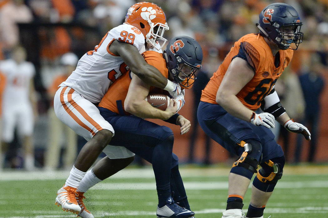 Syracuse was twice pinned inside its own 10 by punts in the first half. The Orange escaped the first time when Christian Wilkins was called for roughing the passer on a third-down play and Dungey rescued them the second with consecutive completions of 20 yards to tight end Ravian Pierce and 15 yards to Jamal Custis.