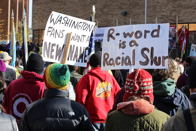 According to organizer Lonny Leitner, a pro-Redskins rally of about 400 people, mostly Native Americans, also took place on campus a couple of blocks away. Signs like “Native and proud to be a Redskin” were present.
