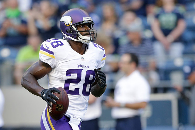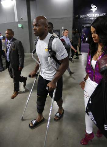 Peterson was hurt in Sunday night’s victory over Green Bay, needing assistance off the field after his knee twisted while being tackled at the end of a run. He has only 50 yards on 31 attempts this season.