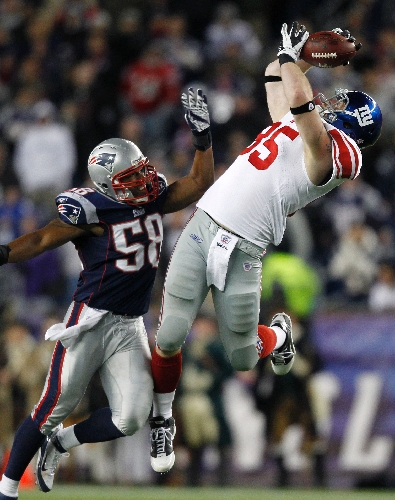 In that 17-14 victory, Manning threw a 13-yard scoring pass to Plaxico Burress with 35 seconds to go. Four plays earlier, David Tyree trapped Manning's third-down pass over the middle on top of his helmet for a 32-yard gain.
