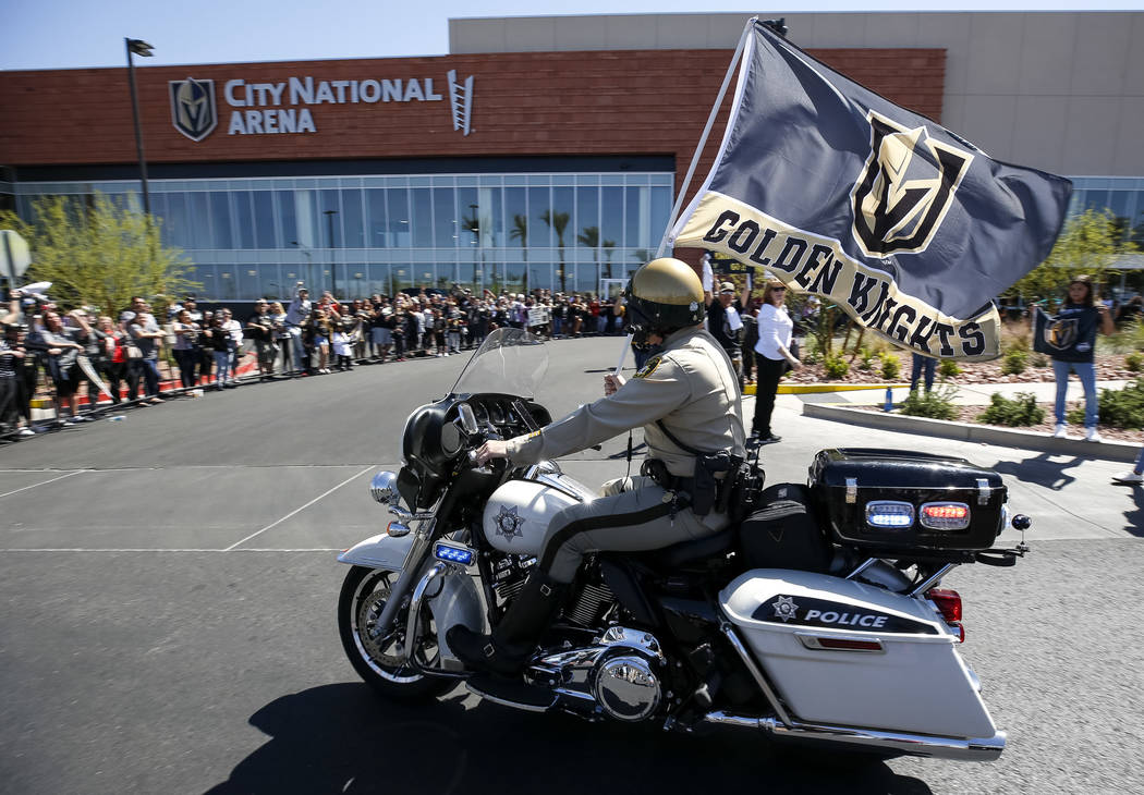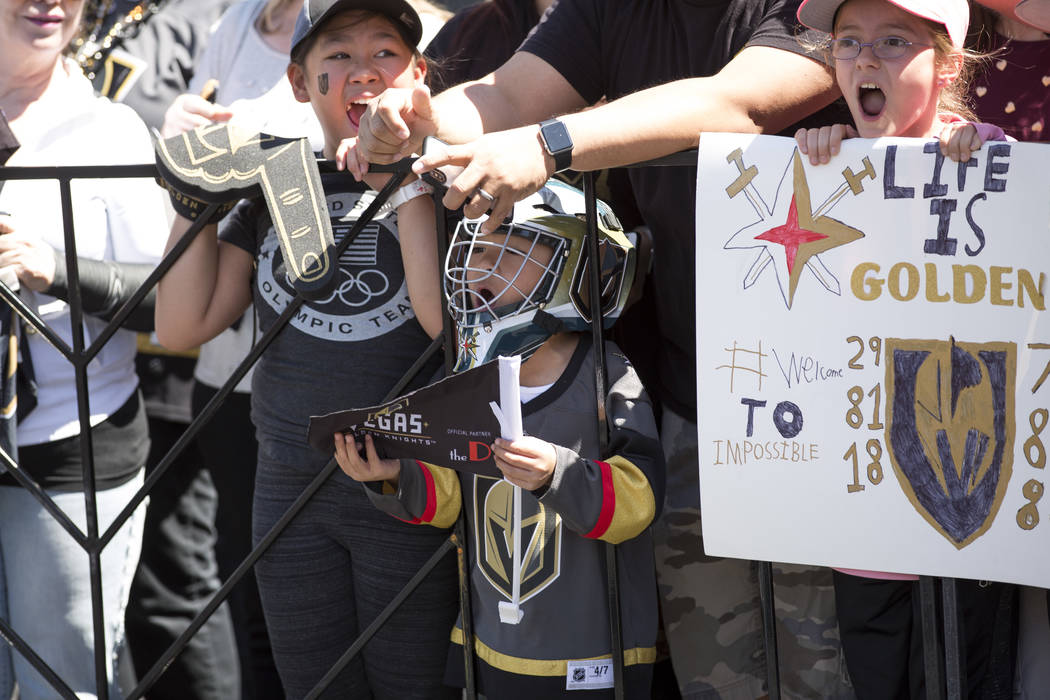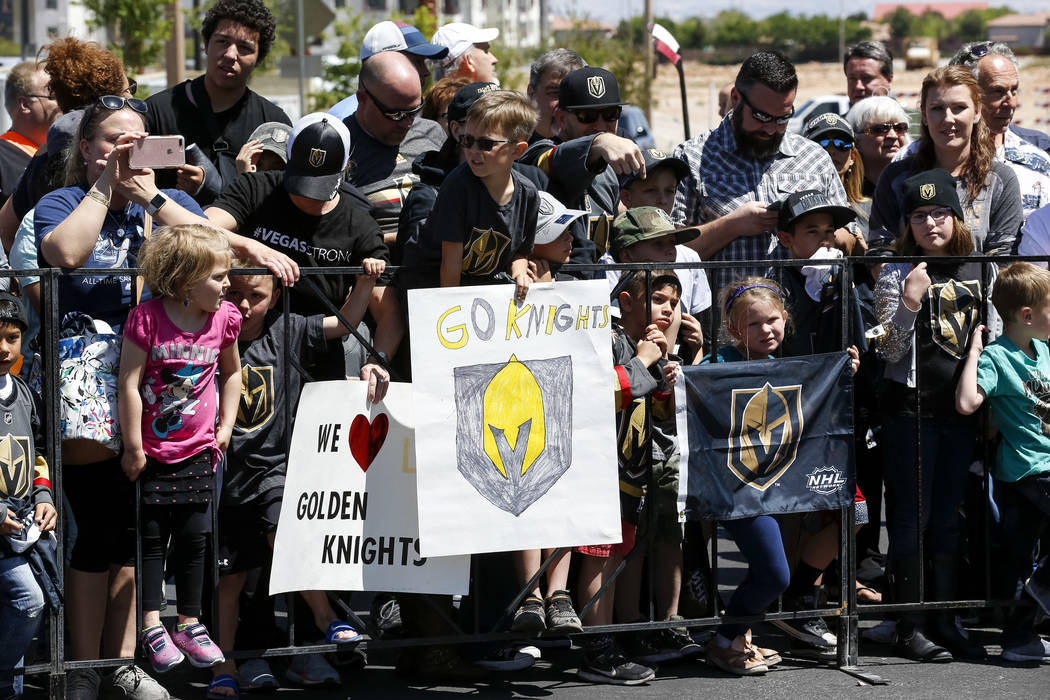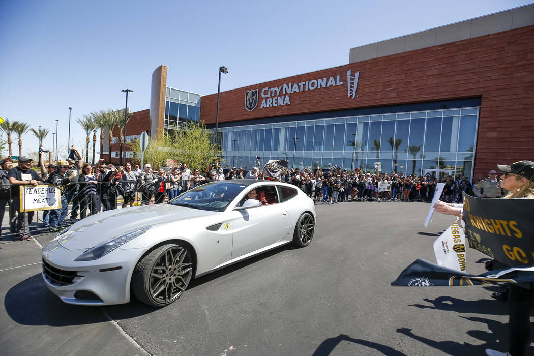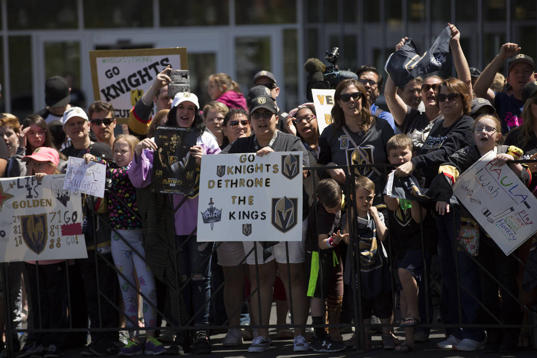 Fans chanted “Go Knights, go” and “Beat LA” as the players whose jerseys many of them wore — Deryk Engelland, Reilly Smith and David Perron, to name a few — drove past and waved. Team owner Bill Foley, wearing a black Golden Knights tee, sunglasses and khakis, estimated there were between 1,500 and 1,600 people in attendance.