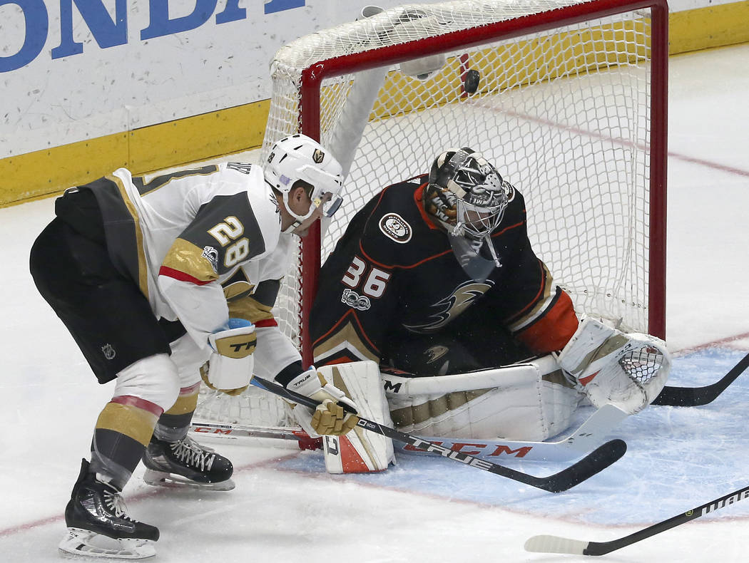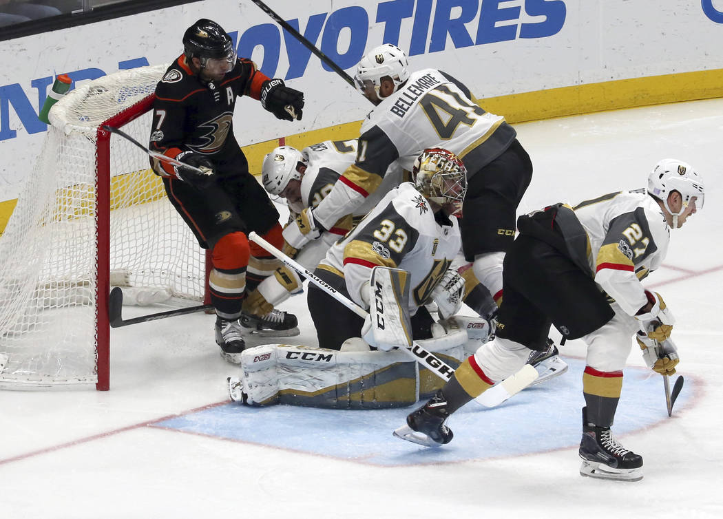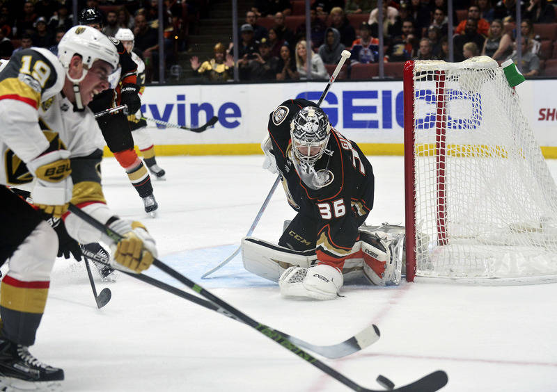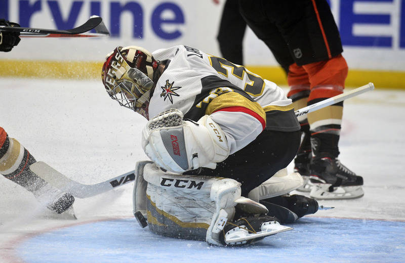The Knights took a franchise record 49 shots on goal, rallying from a 2-0 deficit to improve to 13-6-1. But for a while, it looked as if they weren’t going to solve John Gibson, who was outstanding in the Anaheim net.