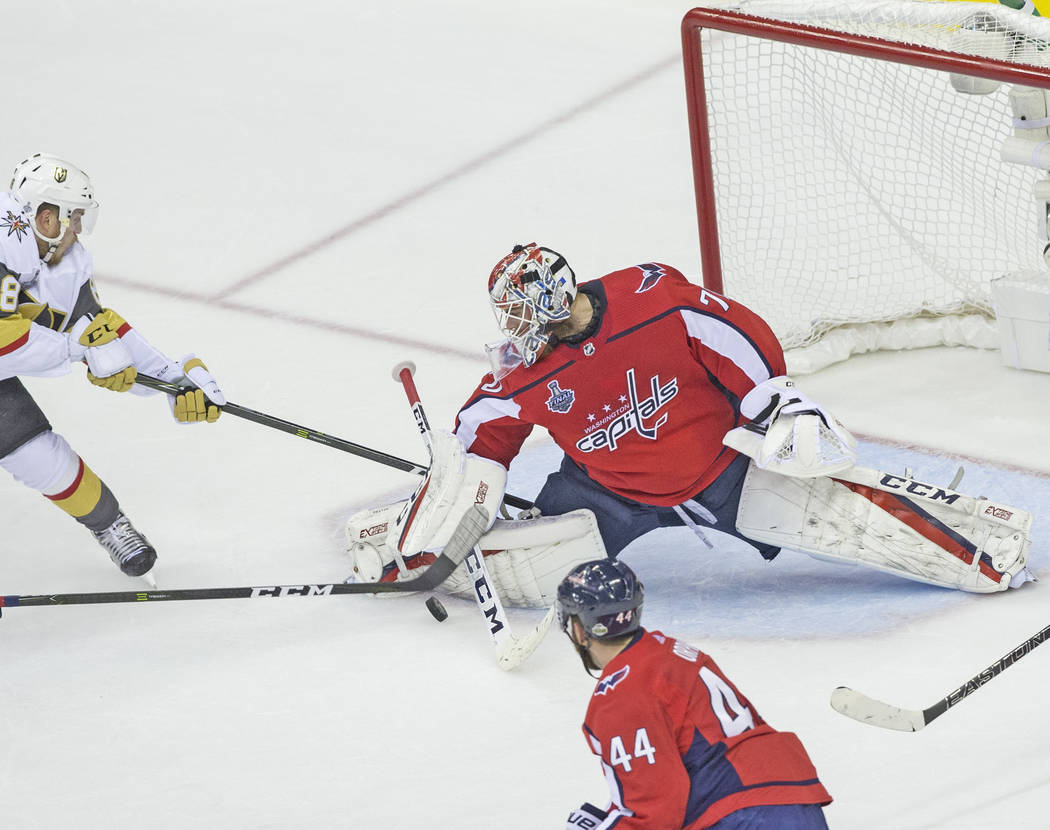 The Capitals made the Knights pay for their profligacy, cashing in on a power play with 10:06 left in the first period. Marc-Andre Fleury (17 saves) made the initial stop on Kuznetsov’s shot, but the rebound went to Oshie, and he flipped the puck over Fleury after kicking it onto his stick.