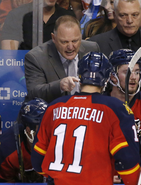 FILE – In this Feb. 15, 2016, file photo, Florida Panthers coach Gerard Gallant talks to center Jonathan Huberdeau (11) during overtime of an NHL hockey game against the Pittsburgh Penguins in Sunrise, Fla. It’s coach firing season in the NHL. Well, actually, that’s every season. Claude Julien of the Boston Bruins on Tuesday, Feb. 7, 2017, became the fourth coach fired this season and the second in a week after the St. Louis Blues canned Ken Hitchcock. The New York Islanders last month fired Jack Capuano and the Florida Panthers in November axed Gallant, who infamously was left outside a visiting arena waiting for a cab. (Wilfredo Lee/AP)