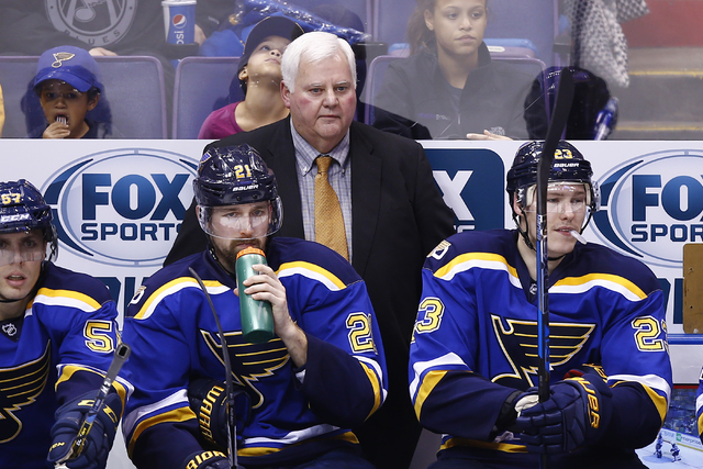 In this Dec. 3, 2016, file photo, St. Louis Blues coach Ken Hitchcock watches from the bench during the third period of the team’s NHL hockey game against the Winnipeg Jets in St. Louis. It’s coach firing season in the NHL. Well, actually, that’s every season. Claude Julien of the Boston Bruins on Tuesday, Feb. 7, 2017, became the fourth coach fired this season and the second in a week after the Blues canned Hitchcock. (Billy Hurst/AP)