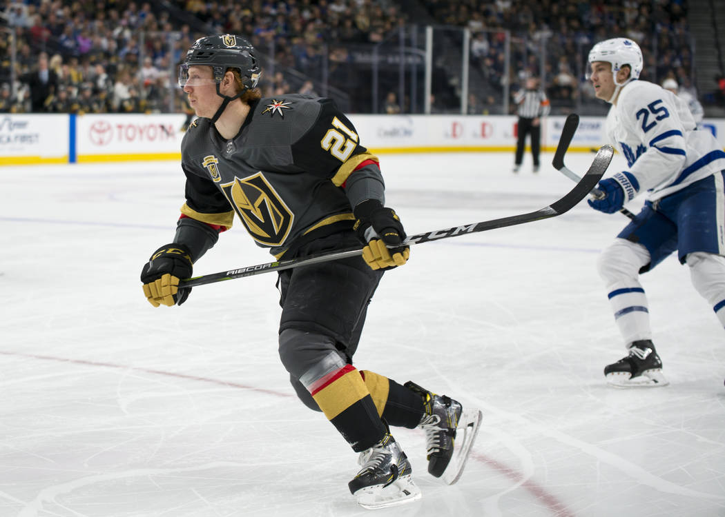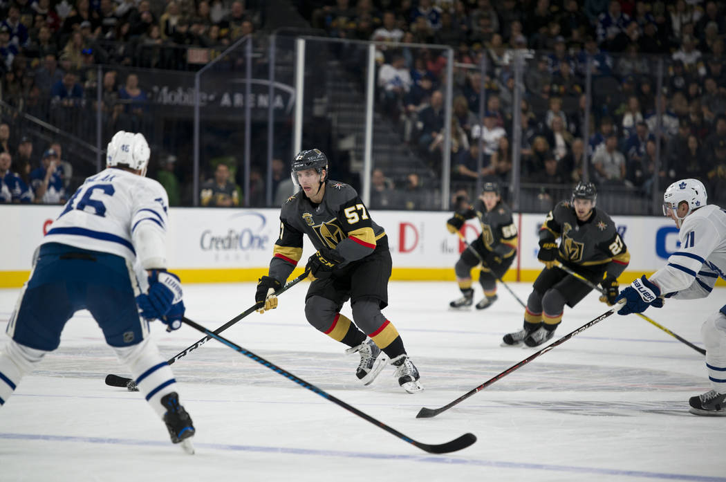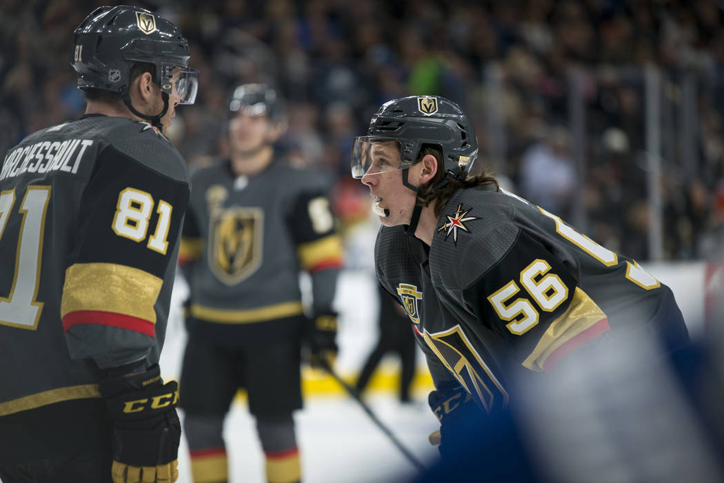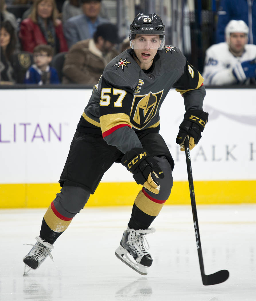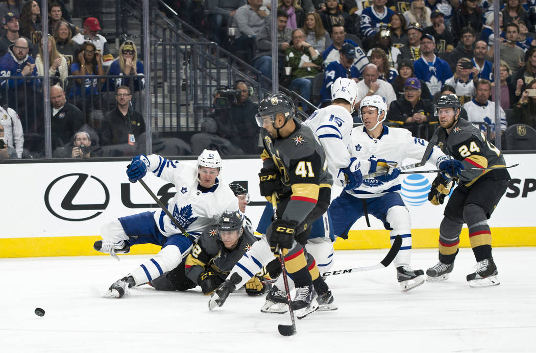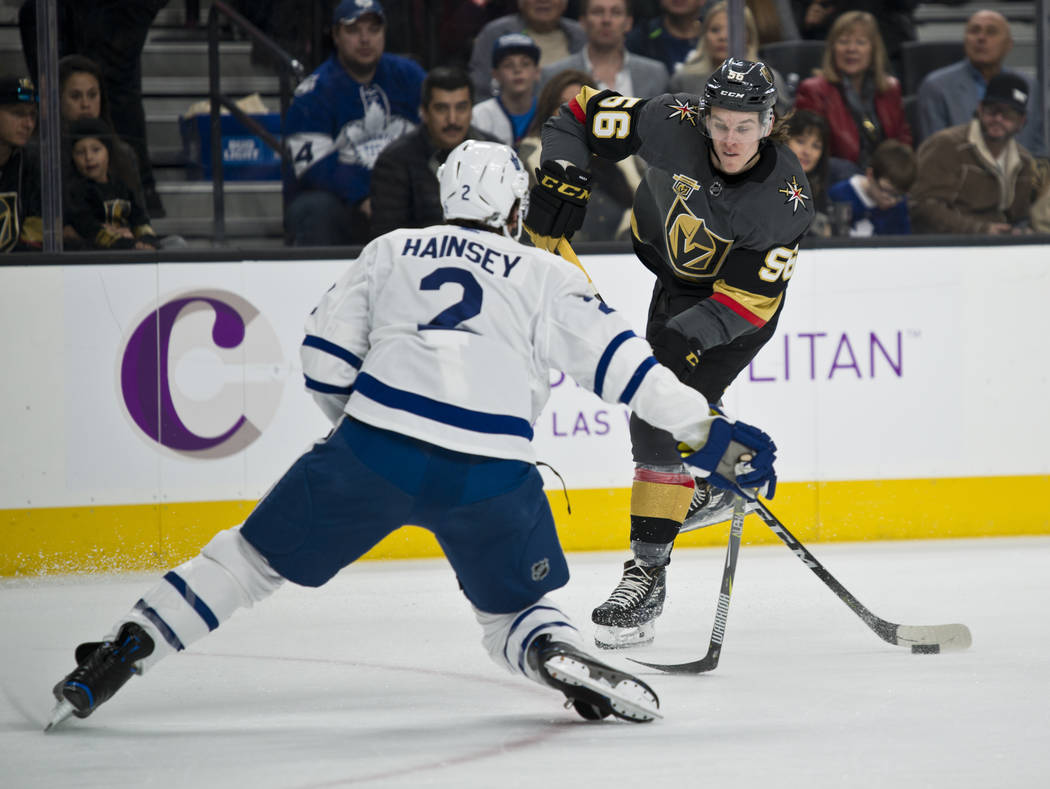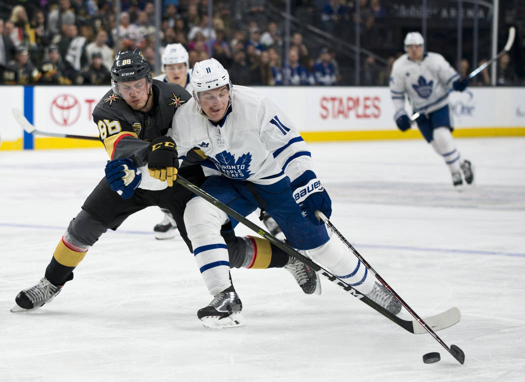 Along with becoming the first Knights player to notch three goals in one game, Karlsson passed James Neal (17) for the team lead in goals with 20. Karlsson’s last one was spectacular as he won a race in the Toronto end, dove and swatted the loose puck on his backhand into the empty net with 1:36 to play after the Leafs had pulled goaltender Frederik Andersen.