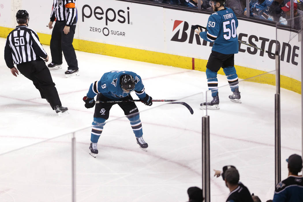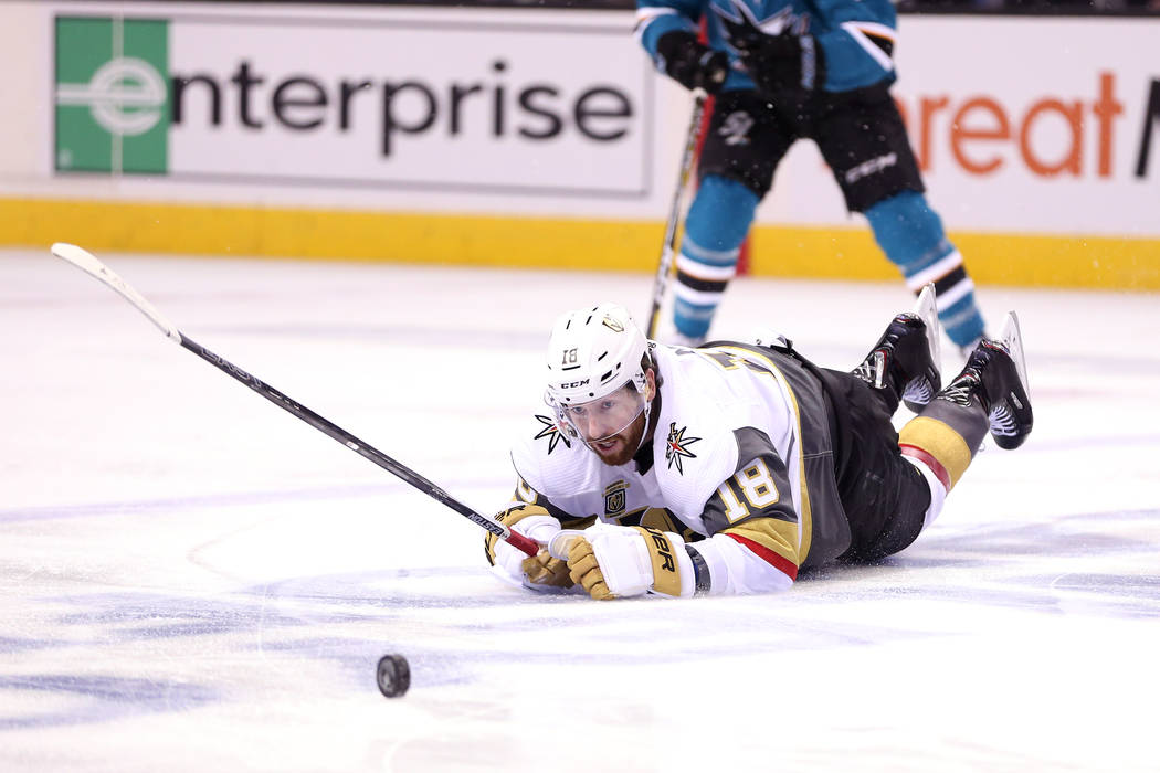 Sharks forward Eric Fehr appeared to make contact with Tuch, which helped give Sorensen extra space, but no penalty was called despite the Knights’ protests.