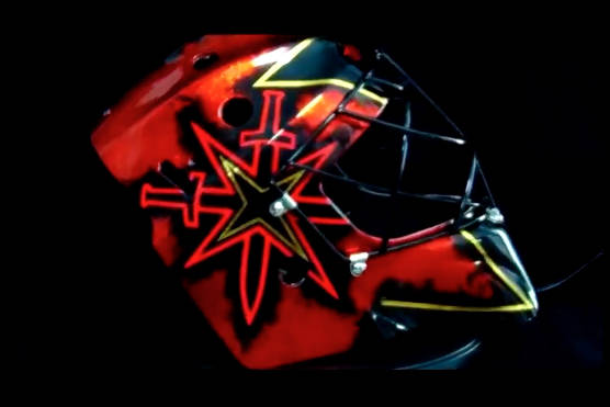 The mask looks similar to previous designs Fleury has worn, but features the Las Vegas skyline in all red as opposed to its traditional coloring. The Knights’ alternate logo is on the other side against a red, glittering backdrop.