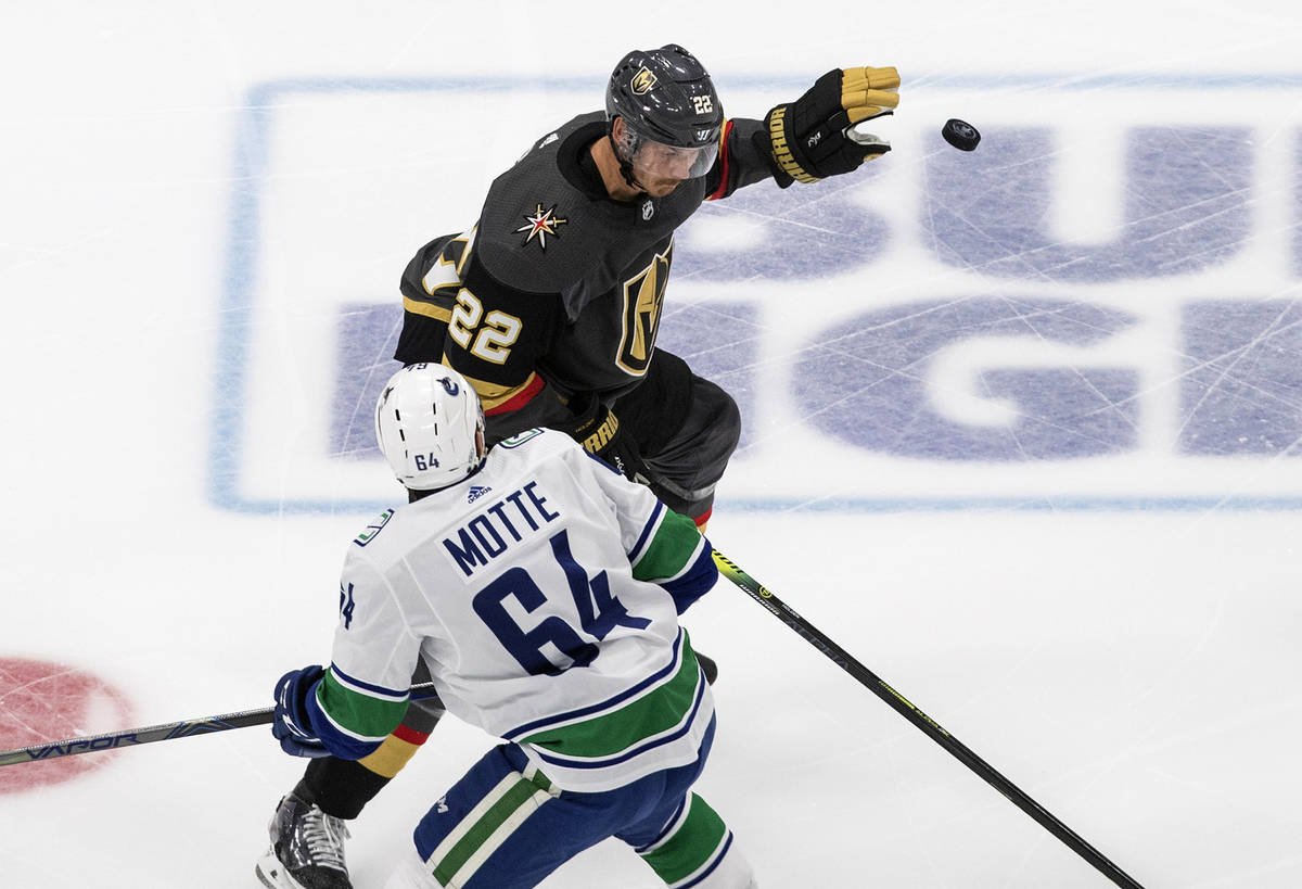 Golden Knights defenseman Zach Whitecloud smacked the glass like a bug on a windshield after Vancouver’s Adam Gaudette ducked out of the way of a check in the first period.