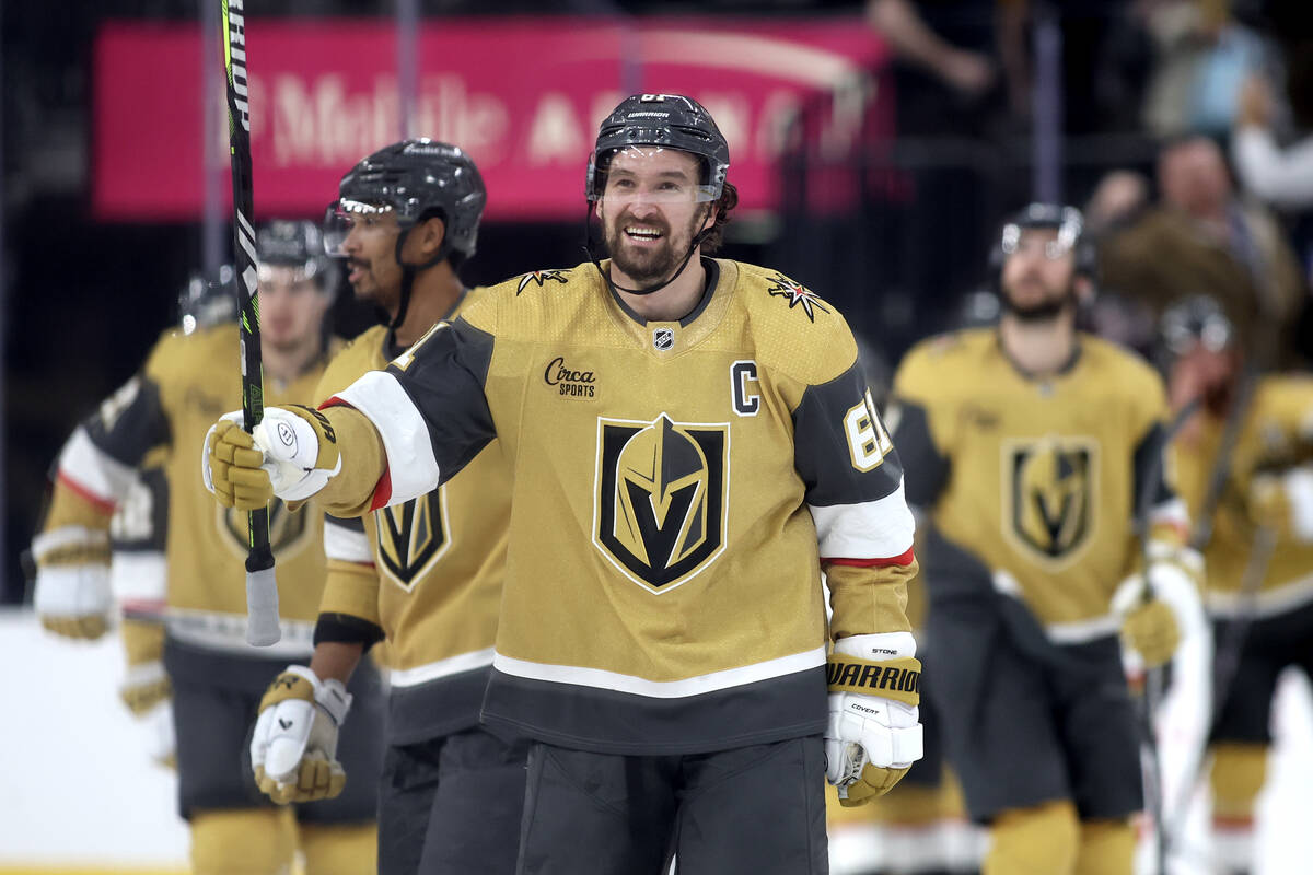 Golden Knights right wing Mark Stone (61) celebrates after the Knights beat the Bruins in overtime of an NHL hockey game at T-Mobile Arena on Thursday, Jan. 11, 2024, in Las Vegas. (Ellen Schmidt/Las Vegas Review-Journal) @ellenschmidttt