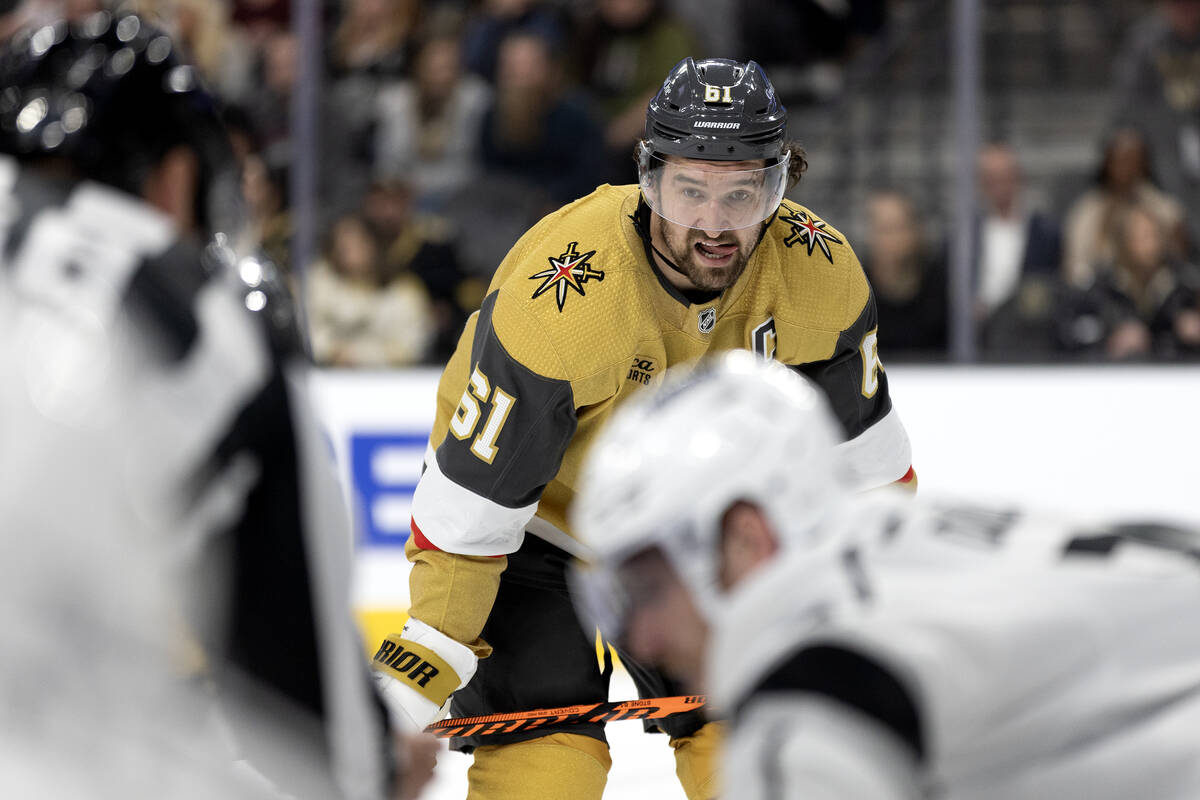 Golden Knights right wing Mark Stone (61) watches the puck in a face-off with the Kings during the first period of an NHL hockey game at T-Mobile Arena on Thursday, Dec. 28, 2023, in Las Vegas. (Ellen Schmidt/Las Vegas Review-Journal) @ellenschmidttt
