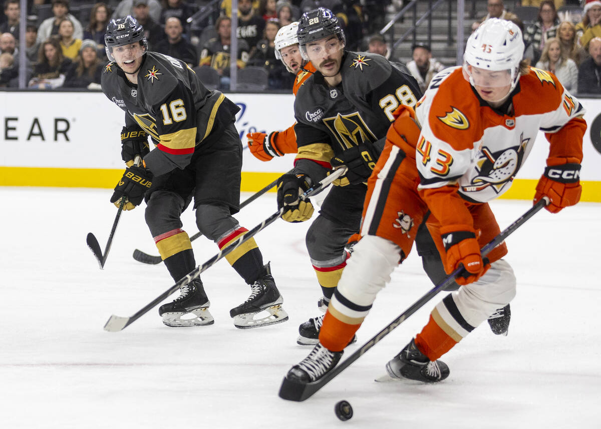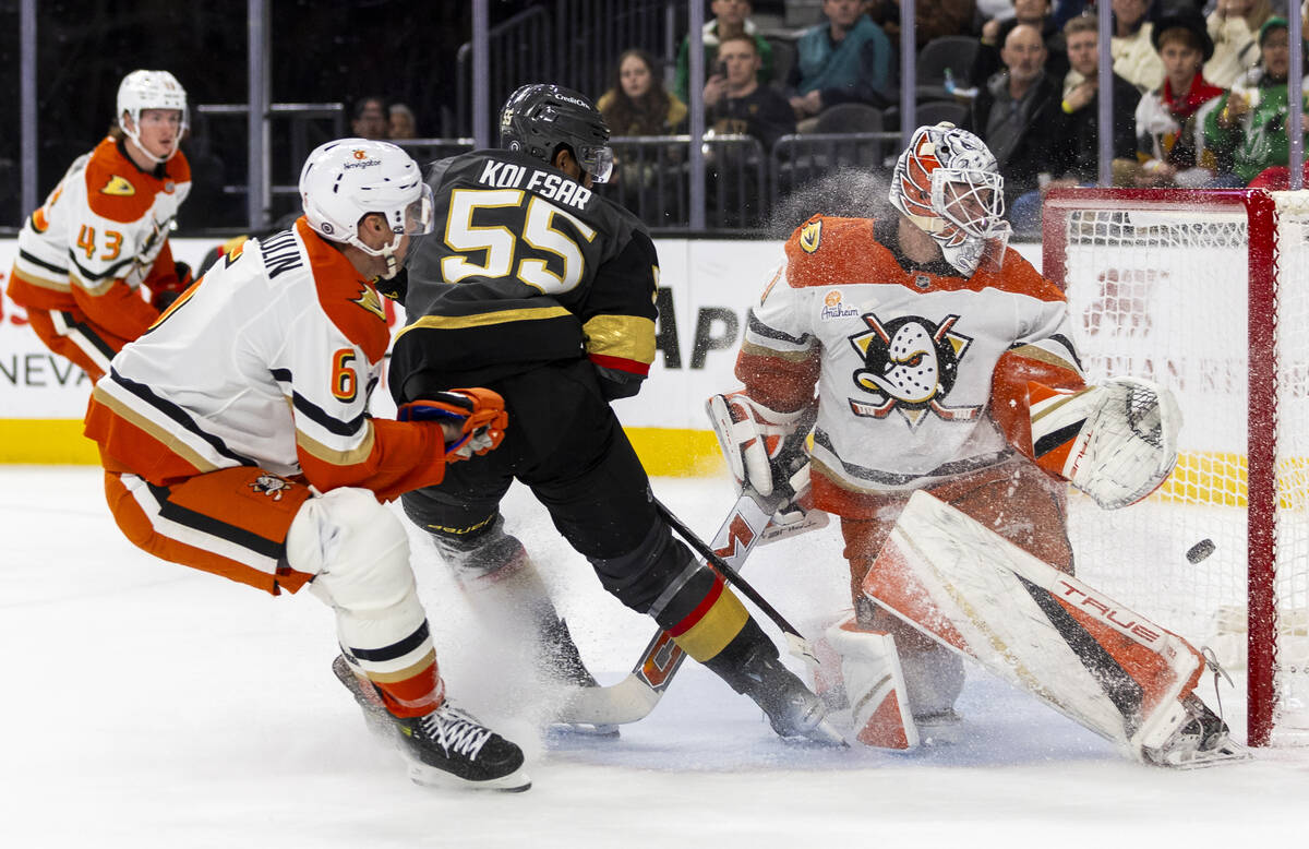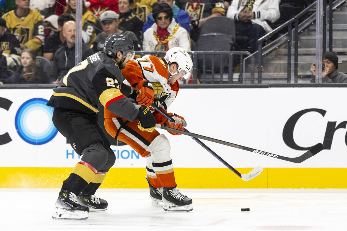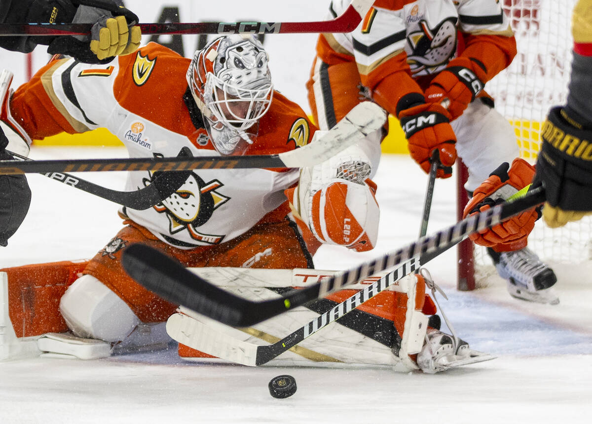 Anaheim goaltender John Gibson stopped the first 11 shots he faced, but left the game late in the first period after taking a stick to the eye from Knights center Tanner Laczynski. Lukas Dostal, who started Sunday for the Ducks, came on in relief.