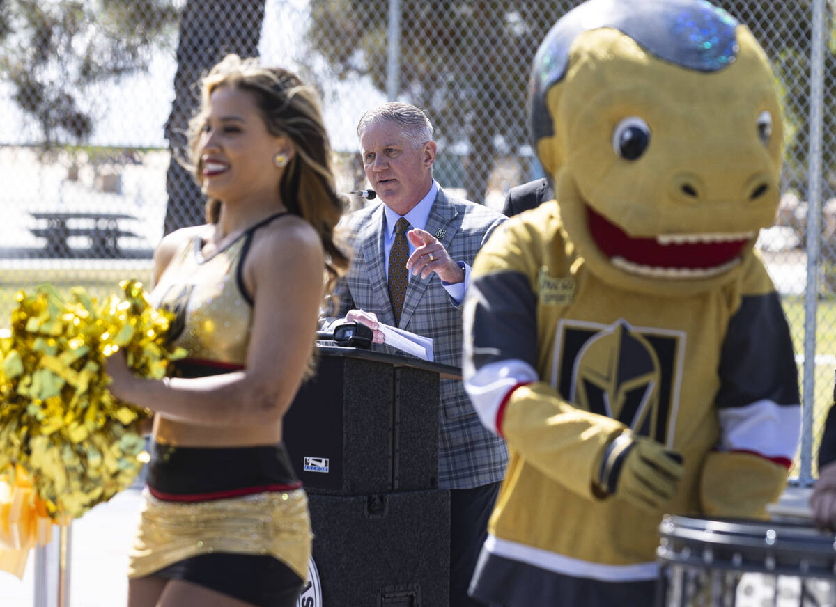 Staccatos from the VGK Drumline snapped and a pair of members from the Vivas — the team’s cheer squad — raised pompoms after the golden ribbon was cut with oversized scissors.