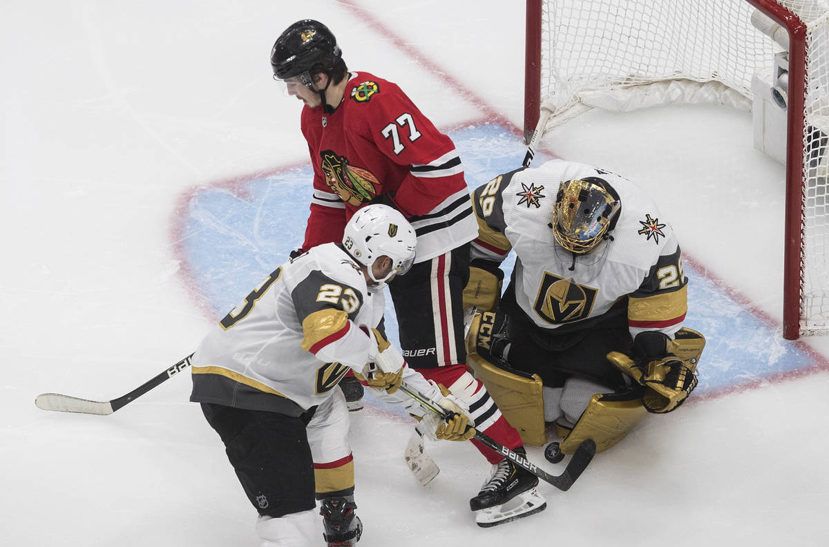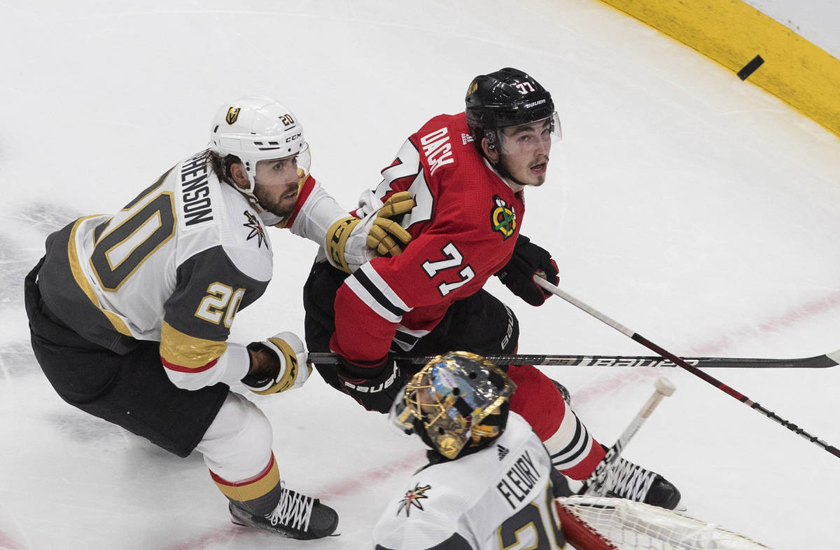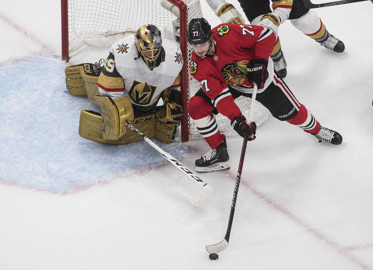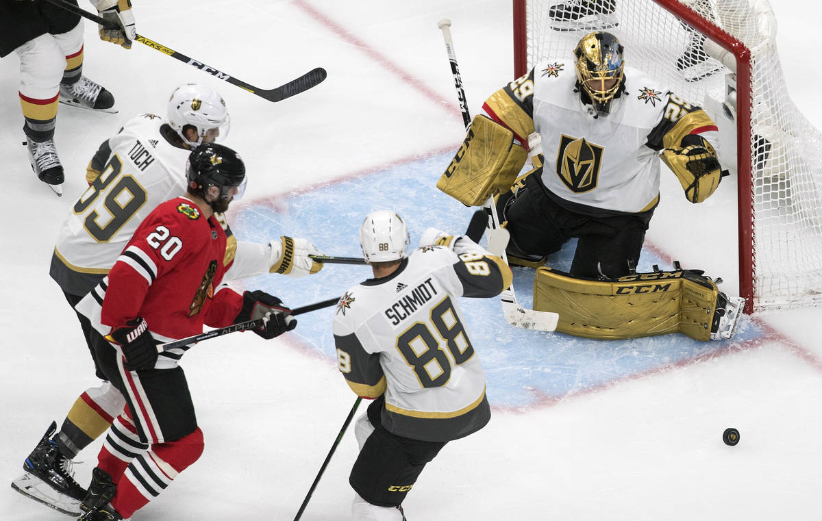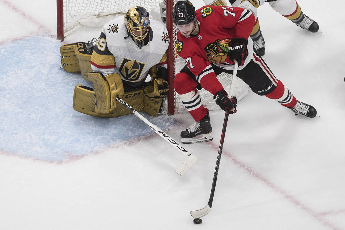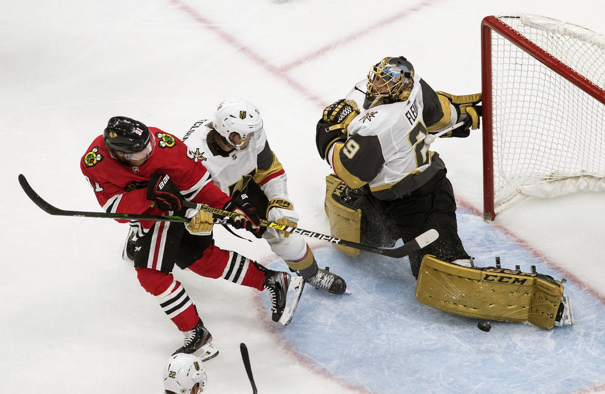 Fleury turned away several scoring chances from Chicago’s Alex DeBrincat and stretched to make a pad save against Patrick Kane on the doorstep to keep the Knights ahead 2-1 midway through the third period.