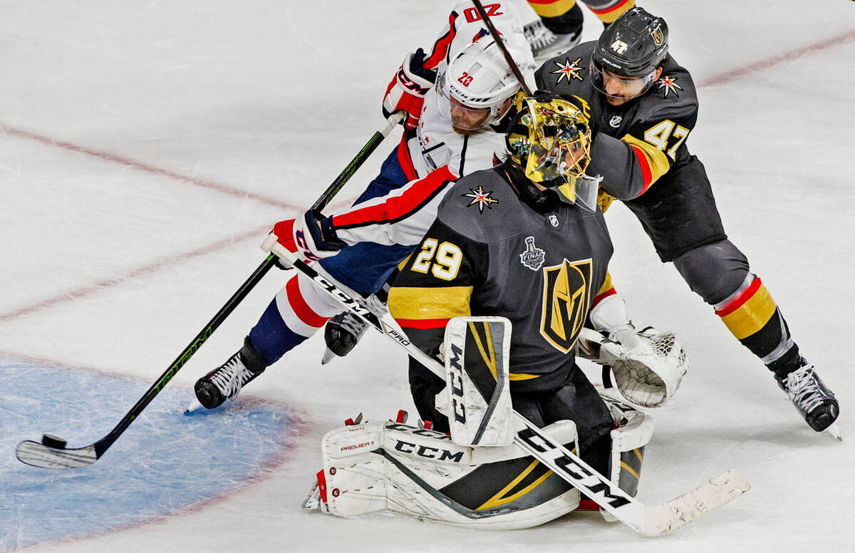 Washington led 3-0 after the first period, and its 1-1-3 neutral-zone trap continued to frustrate the Knights.