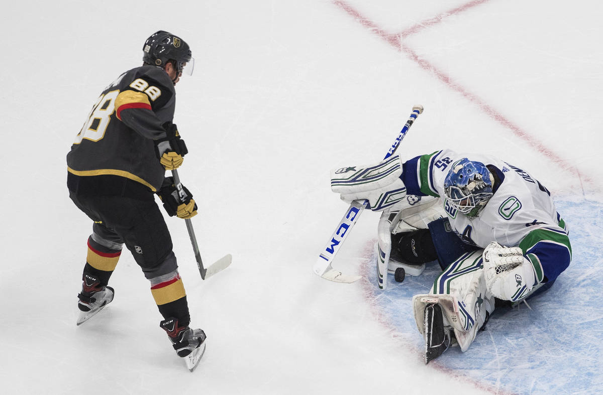 After Robin Lehner made one of the saves of the season on a breakaway, Demko found himself laid out in the crease only to flop around and keep the puck out of the net under an onslaught of Knights shots.