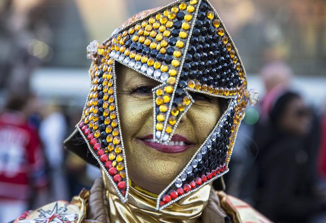 Shirley Williams in her Halloween outfit outside T-Mobile Arena before the start of the Golden Knights NHL hockey game with the Montreal Canadiens on Thursday, Oct. 31, 2019, in Las Vegas. (Benjamin Hager/Las Vegas Review-Journal) @benjaminhphoto