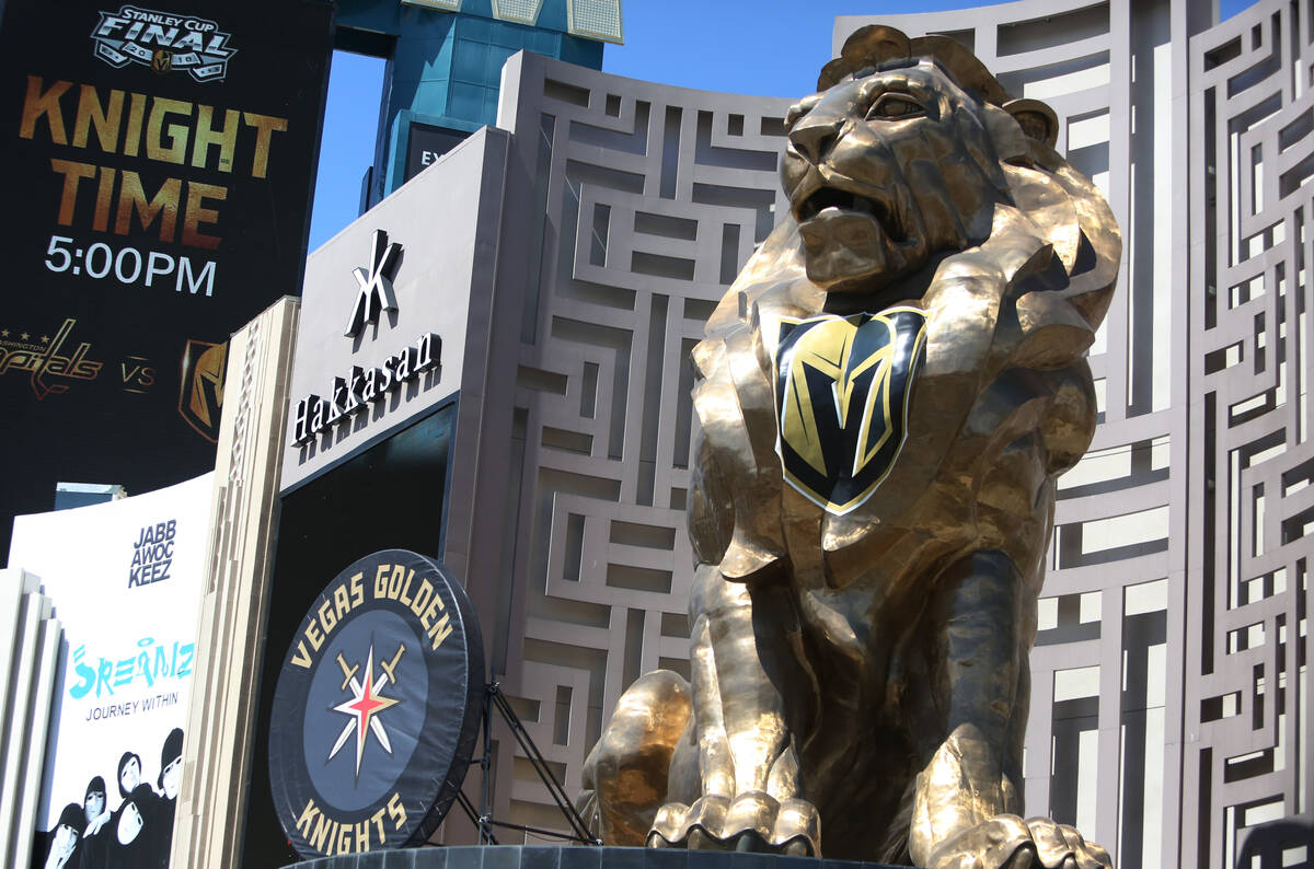 A giant puck promoting the Vegas Golden Knights is displayed outside the MGM Grand next to Leo the lion at the intersection of Flamingo Road and Las Vegas Boulevard South in Las Vegas on Monday, May 28, 2018. Bizuayehu Tesfaye/Las Vegas Review-Journal @bizutesfaye