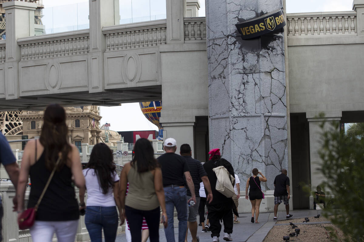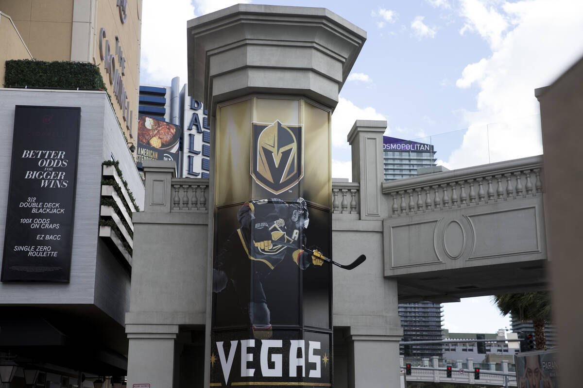 A Vegas Golden Knights banner on a pedestrian bridge at the intersection of Flamingo Road and Las Vegas Boulevard South in Las Vegas, Saturday, April 7, 2018. Las Vegas Review-Journal @Erik_Verduzco
