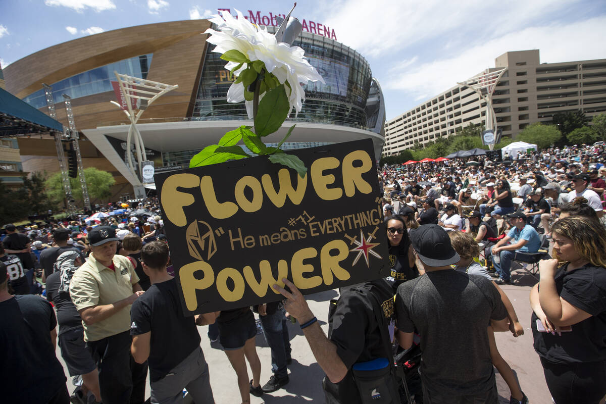A Golden Knights fan carries a Marc-Andre Fleury sign during a watch party for Game 5 of the Western Conference Finals between the Golden Knights and the Winnipeg Jets at Toshiba Plaza in Las Vegas on Sunday, May 20, 2018. Richard Brian Las Vegas Review-Journal @vegasphotograph