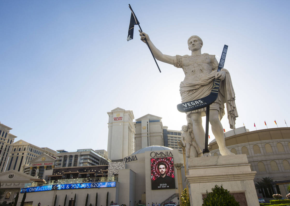 A statue of Julius Caesar is seen adorned with a Golden Knights flag and hockey stick outside of Caesars Palace in Las Vegas on Tuesday, May 15, 2018. Chase Stevens Las Vegas Review-Journal @csstevensphoto