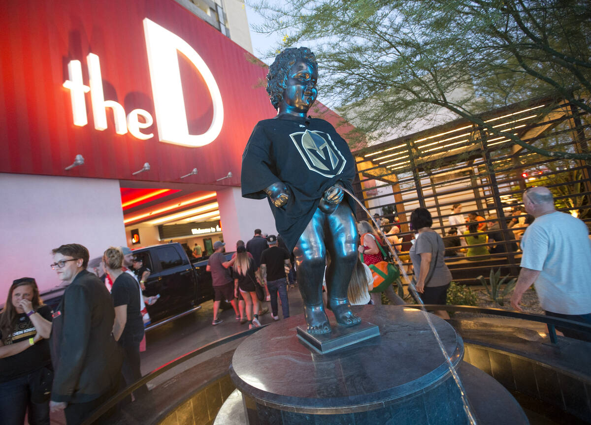 A Vegas Golden Knights t-shirt is seen on the Manneken Pis statue outside the D Las Vegas following a watch party for Game 3 of the Stanley Cup Final between the Golden Knights and the Washington Capitals at the Downtown Las Vegas Events Center on Saturday, June 2, 2018. Richard Brian Las Vegas Review-Journal @vegasphotograph