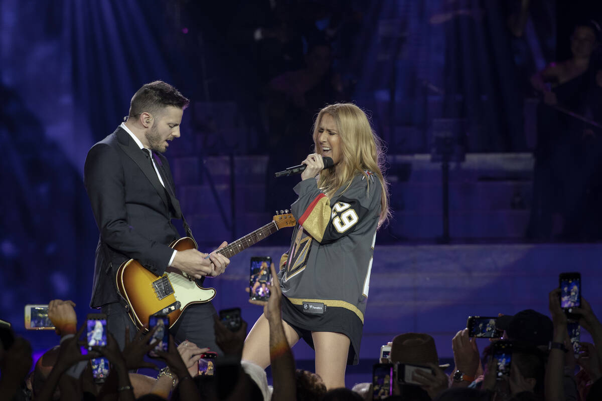 Celine Dion, shown with guitarist Kaven Girouard, sports a Marc-Andre Fleury Vegas Golden Knights jersey during her return to the Colosseum at Caesars Palace after minor ear surgery on Tuesday, May 22, 2018. (Cashman Photo)