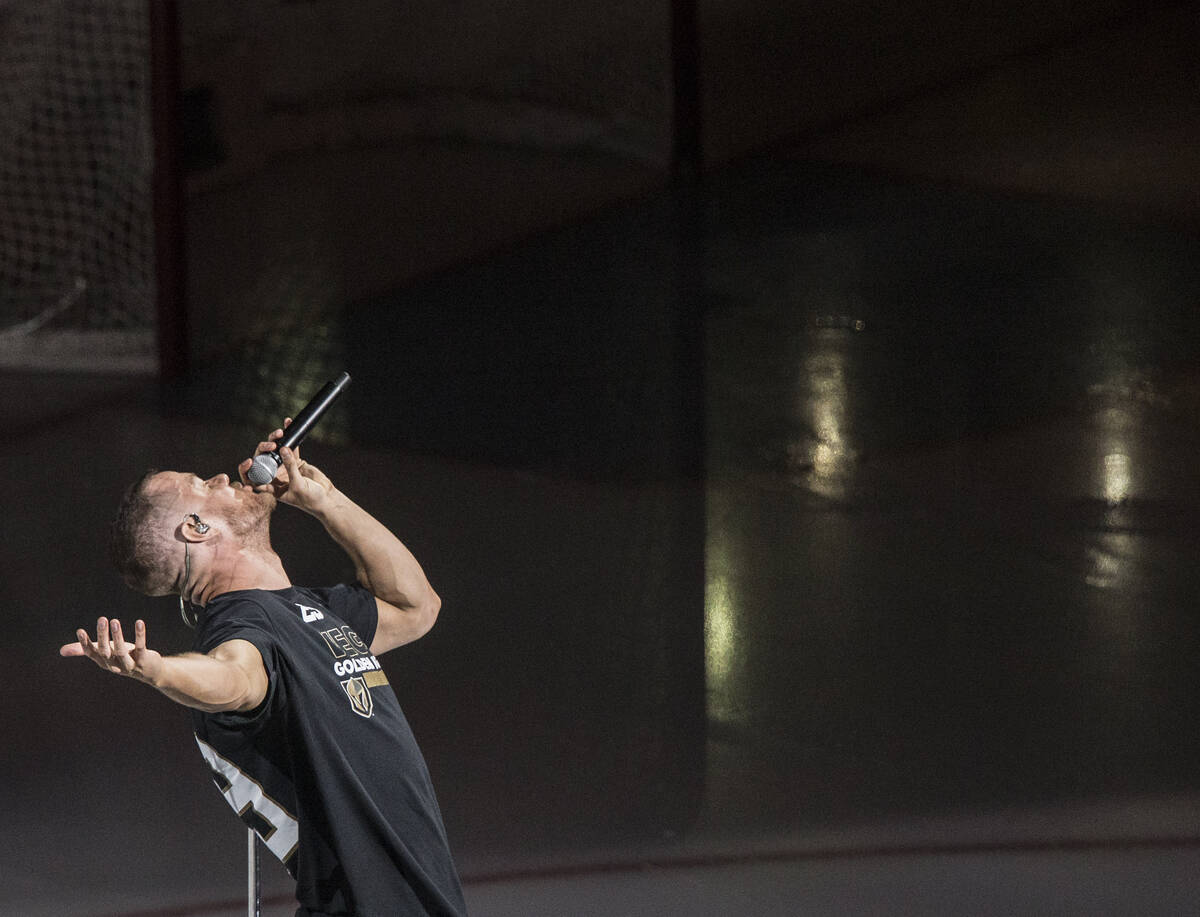 Dan Reynolds, lead singer of Imagine Dragons, performs "Whatever It Takes" before the start of Game 2 of the NHL Stanley Cup Final between the Golden Knights and Washington Capitals on Wednesday, May 30, 2018, at T-Mobile Arena, in Las Vegas. Benjamin Hager Las Vegas Review-Journal @benjaminhphoto