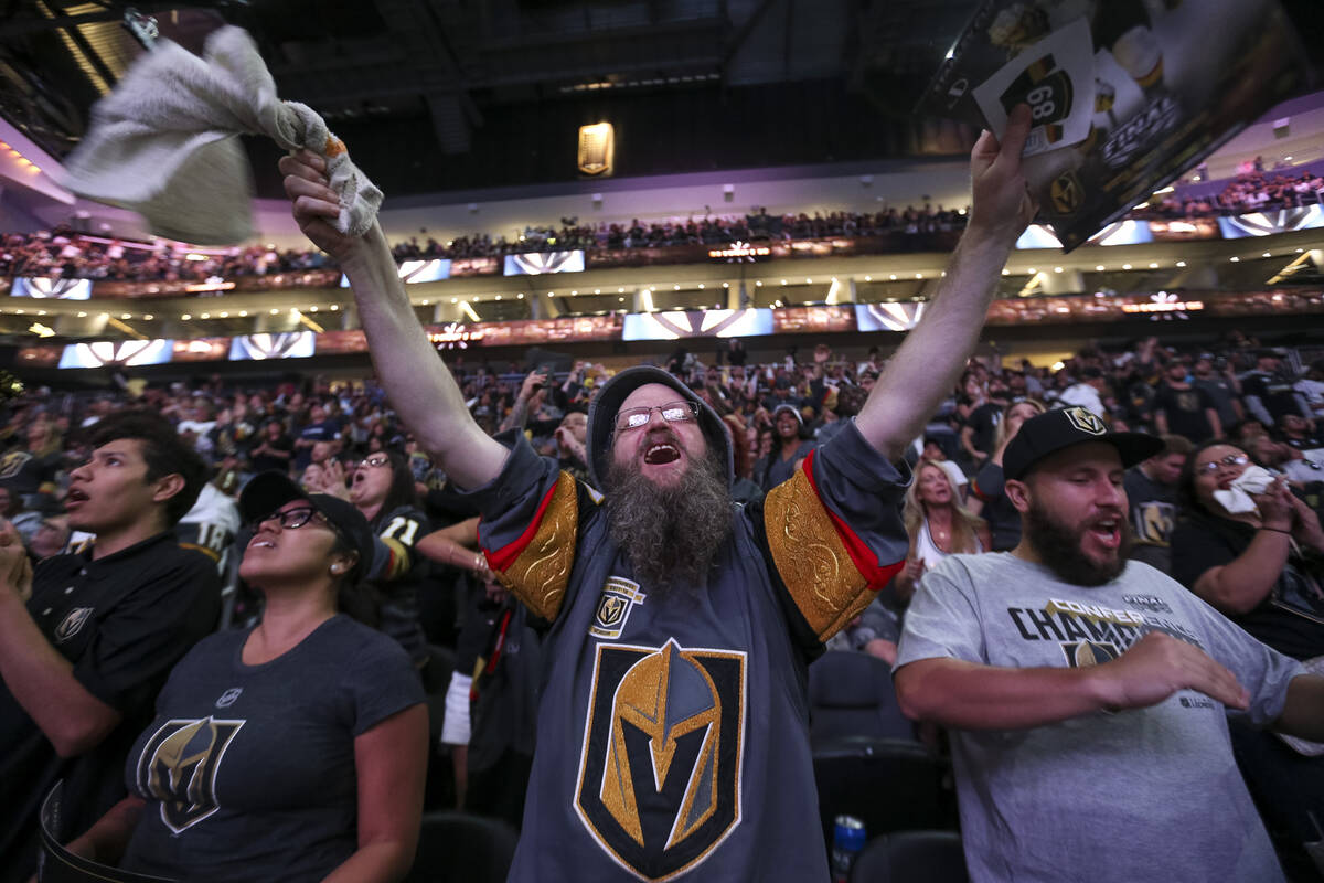 Daryl Keppner of Pahrump celebrates a third period goal by Vegas Golden Knights right wing Reilly Smith (19) during a watch party for Game 4 of the Stanley Cup Final between the Golden Knights and the Washington Capitals at T-Mobile Arena in Las Vegas on Monday, June 4, 2018. Richard Brian Las Vegas Review-Journal @vegasphotograph