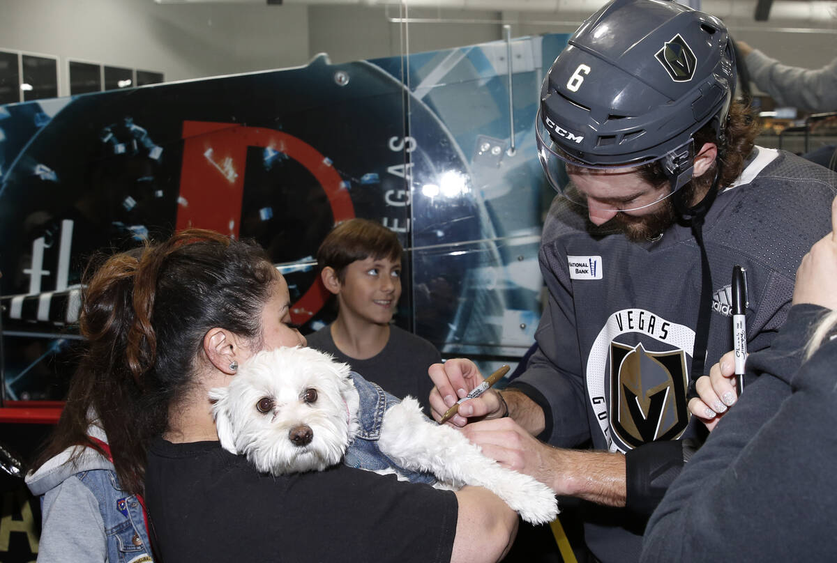 Golden Knights defenseman Colin Miller signs an autograph on the collar of Julissa Garcia’s dog Pinky after team practice at City Center Arena on Wednesday, May 23, 2018, in Las Vegas. Bizuayehu Tesfaye/Las Vegas Review-Journal @bizutesfaye