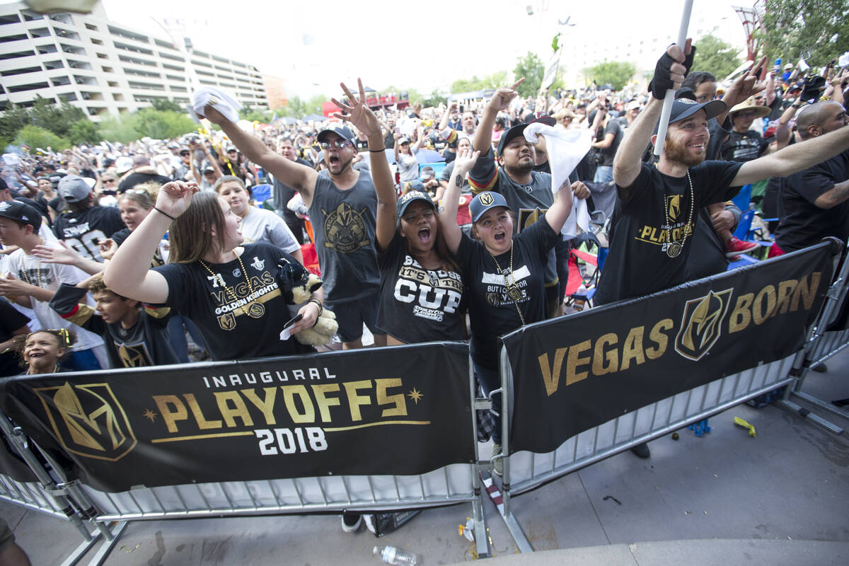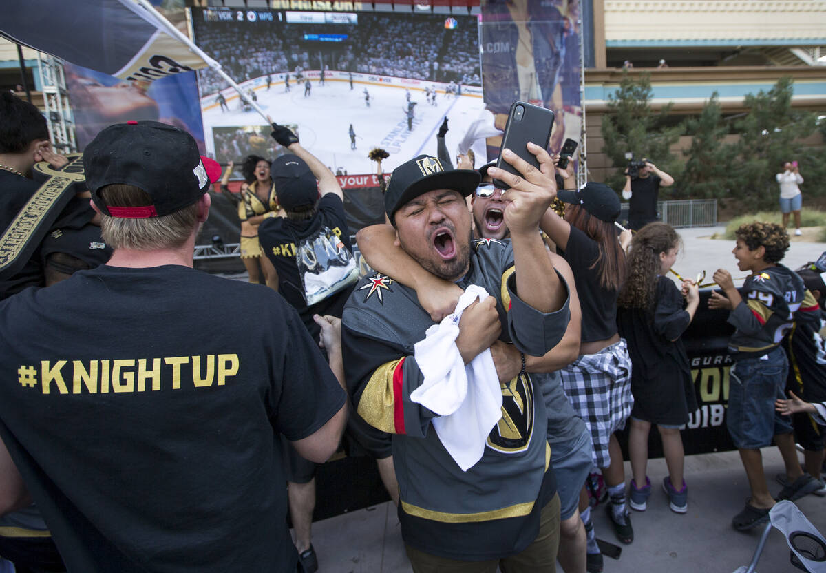 Golden Knights fans celebrate after the Knights defeated the Winnipeg Jets 2-1 during a watch party for Game 5 of the Western Conference Finals at Toshiba Plaza in Las Vegas on Sunday, May 20, 2018. Richard Brian Las Vegas Review-Journal @vegasphotograph