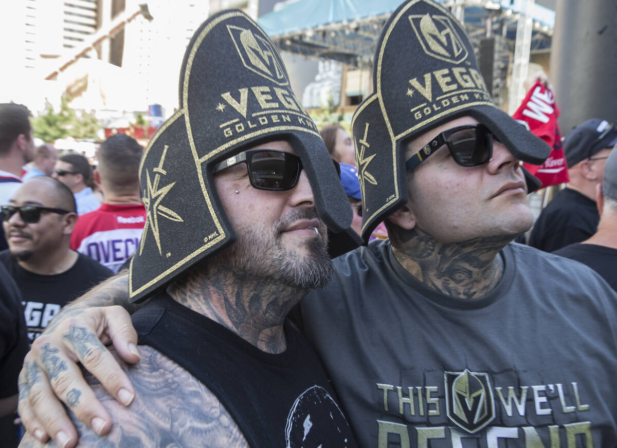 Golden Knights fans Erik Foley, left, and Karl Rutledge outside T-Mobile Arena before the start of Game 2 of the NHL Stanley Cup Final with the Washington Capitals on Wednesday, May 30, 2018, at T-Mobile Arena, in Las Vegas. Benjamin Hager Las Vegas Review-Journal @benjaminhphoto