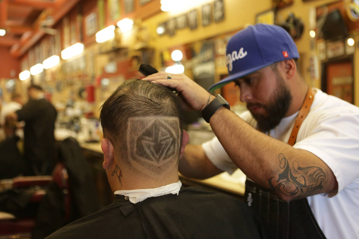 Moises “Moy The Barber” Alvarez, right, owner of the Goodtimes Barber Shop & Shave Parlor on Sahara in Las Vegas, puts finishing touches on a Golden Knights haircut for Fernando Guzman on Friday, May 25, 2018. Michael Quine Las Vegas Review-Journal @Vegas88s