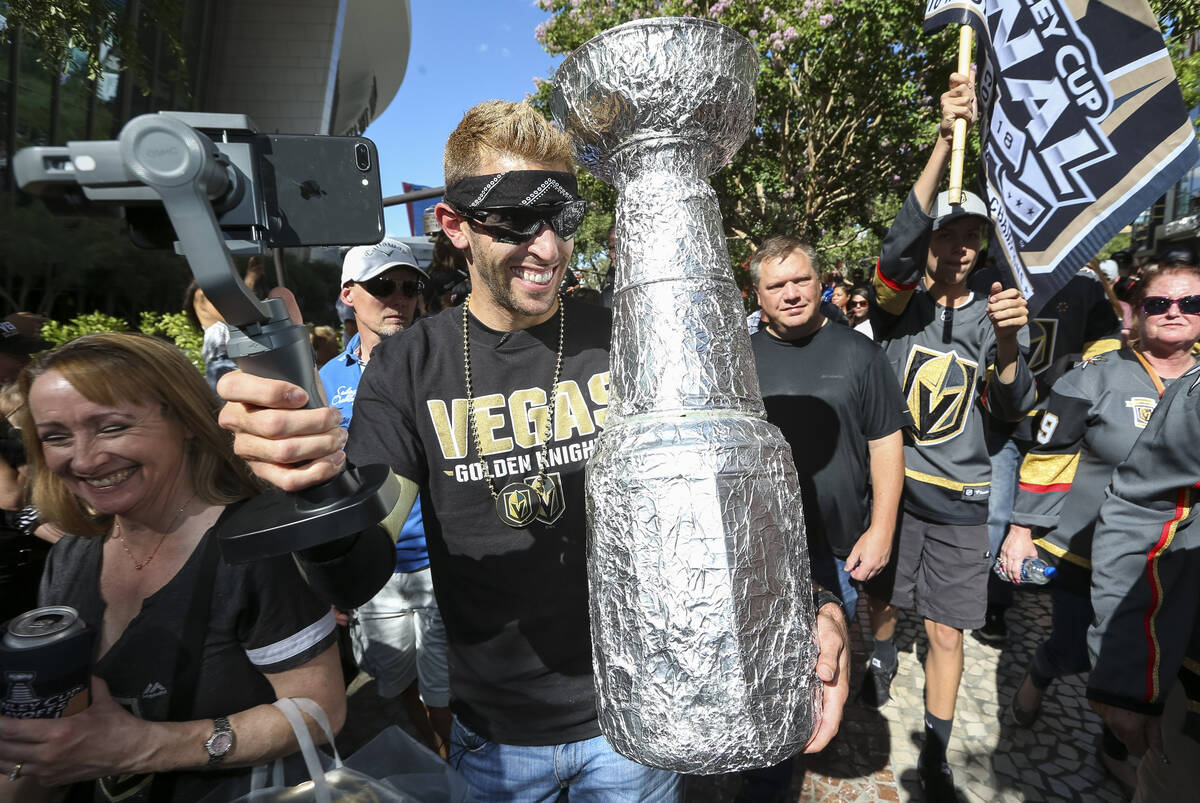 Vegas Golden Knights fan Brandon Laubhan holds a make shift Stanley Cup before Game 1 of the NHL hockey Stanley Cup Final between the Vegas Golden Knights and the Washington Capitals outside T-Mobile Arena in Las Vegas on Monday, May 28, 2018. Richard Brian Las Vegas Review-Journal @vegasphotograph