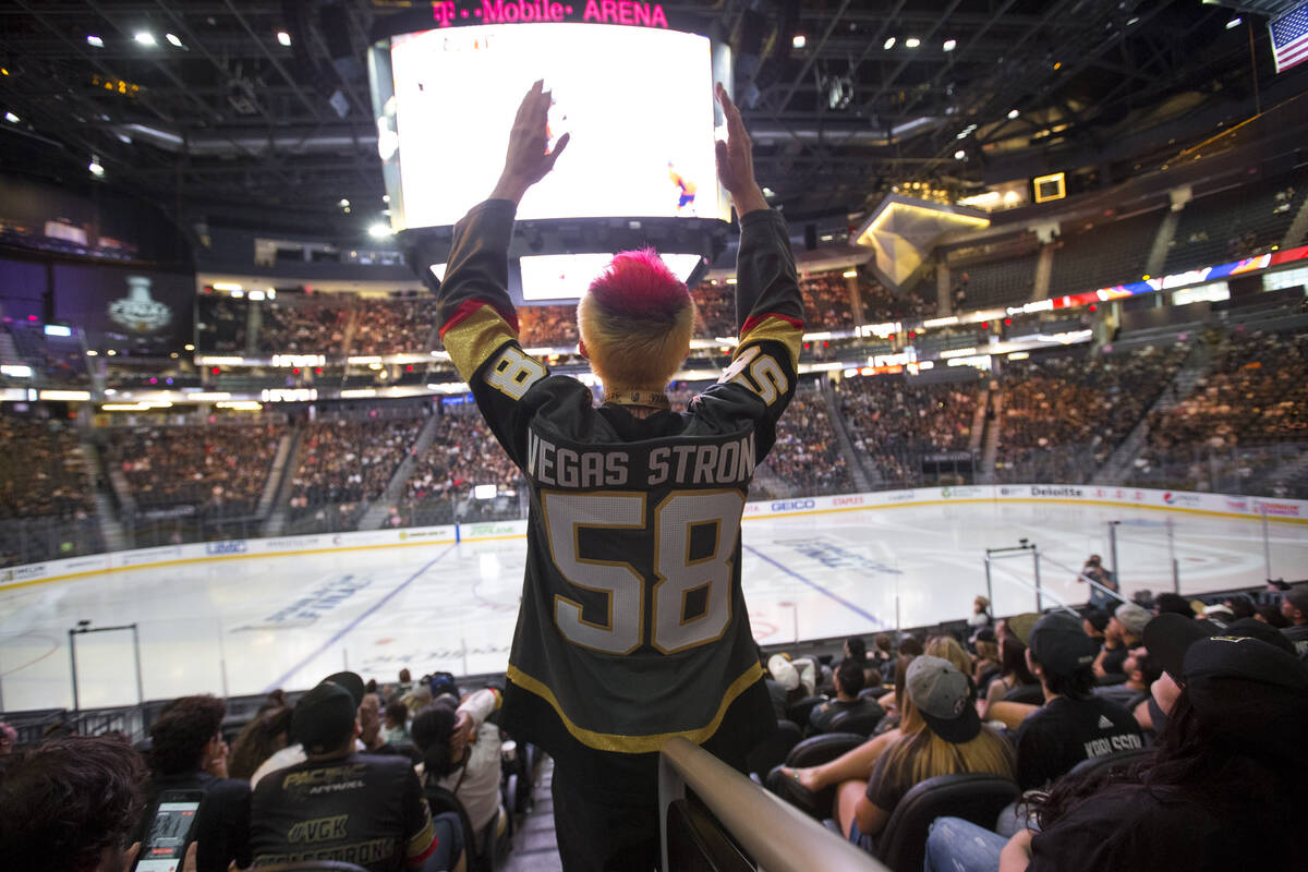 Vegas Golden Knights fan Jay Bryant-Chavez reacts to a play during a watch party for Game 4 of the Stanley Cup Final between the Golden Knights and the Washington Capitals at T-Mobile Arena in Las Vegas on Monday, June 4, 2018. Richard Brian Las Vegas Review-Journal @vegasphotograph
