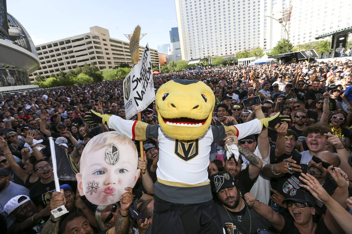 Golden Knights mascot Chance, left, entertains the crowd during "Stick Salute to Vegas and Our Fans" on Wednesday, June 13, 2018, at the Fremont Street Experience, in Las Vegas. Benjamin Hager Las Vegas Review-Journal @benjaminhphoto
