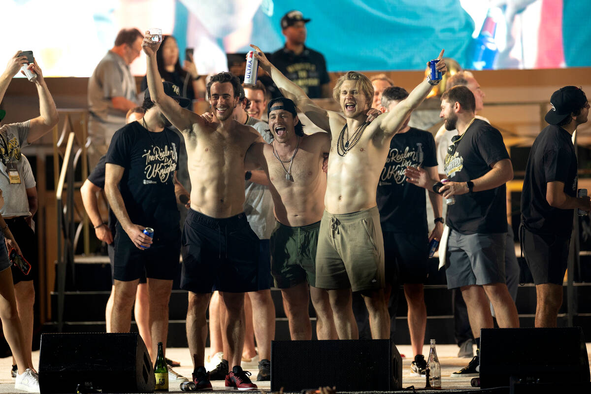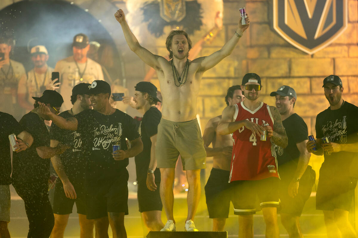 He then let loose after the Knights won it all. The team paraded down the Strip in buses June 17, four days after clinching its championship, then went to a rally in front of T-Mobile Arena. Karlsson stumbled as soon as the Knights arrived on stage. He lost his shirt soon afterward.