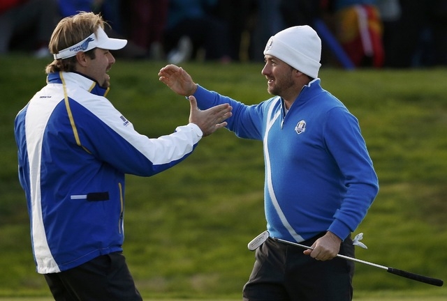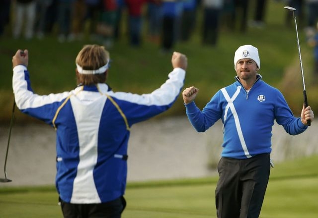 Cries of ‘Europe, Europe, Europe’ rang around the Jack Nicklaus-designed PGA Centenary Course and the pair celebrated with a delighted hug and a high-five.