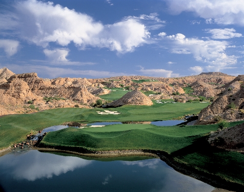 Wolf Creek opens with a 579-yard par 5 that plays through a canyon and can be reached in two only by prodigious drivers. It is helpful that the elevation drops significantly from the tee to the fairway, because the second shot plays almost as steeply uphill. A word of caution to those who reach for the green with a fairway metal: the hidden water hazard short and right of the green is closer than it seems. Knowing the pin position is critical here, as two-putting from above the hole is quite a challenge.