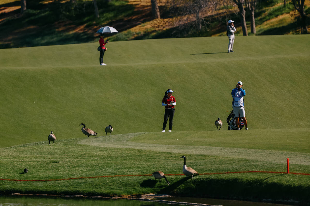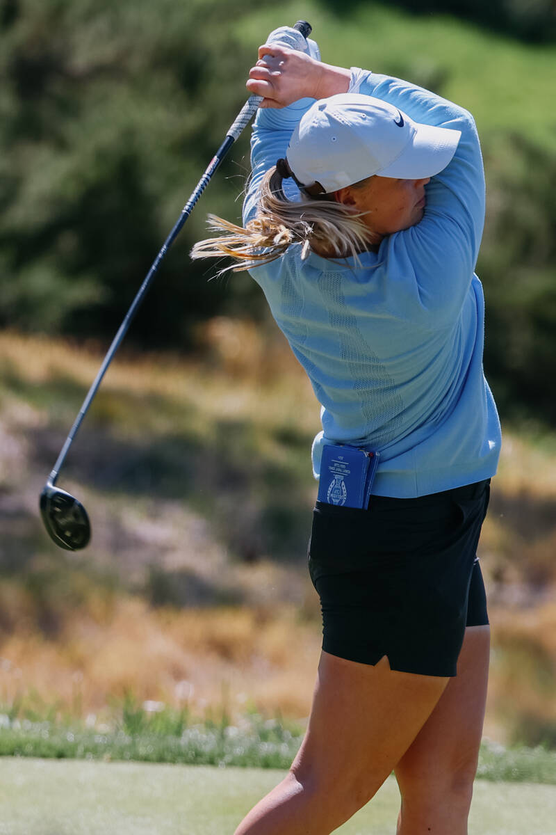 “No, no, no, not on this golf course. I mean, this golf course anything can happen,” she said of her comfort level. “My chip-in on 13 really helped me feel confident, because the golf course is getting ridiculously hard. Everything is like concrete hard, and putts are hard.”