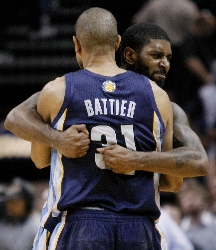 KEY: Shane Battier's 3-pointer with 23.9 seconds remaining gave the Grizzlies a 99-98 lead, and they gained the franchise's first playoff victory.